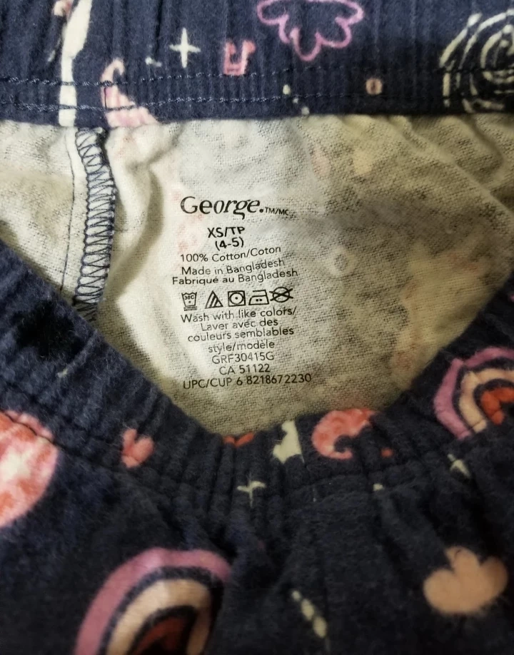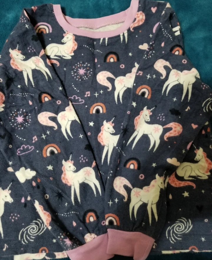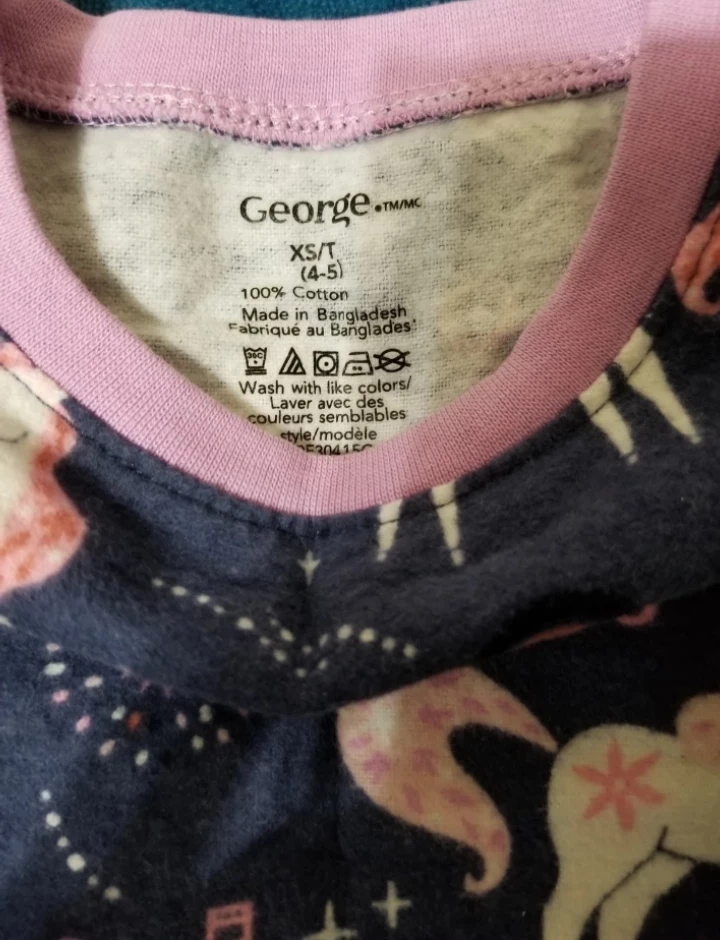 Super cute George brand pajamas with a unicorn print! They are size XS (4-5) and made of 100% cotton. These are perfect for your little one to wear to bed on a cold night!