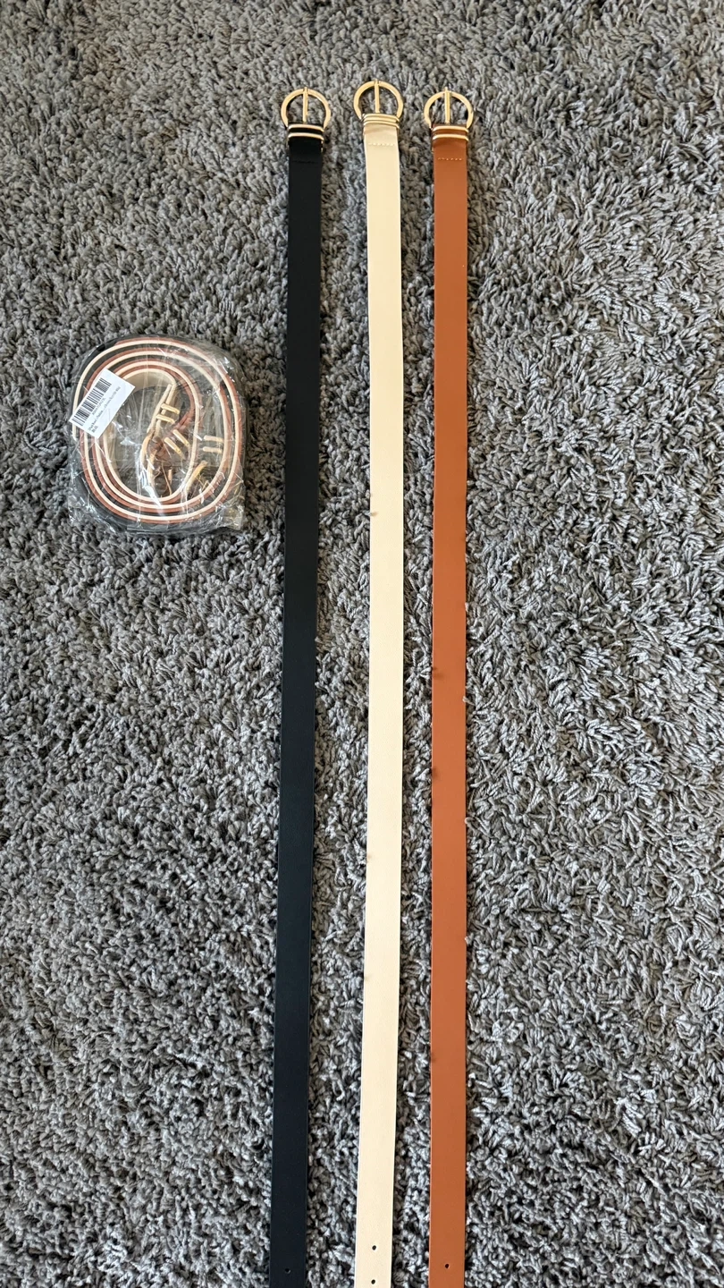 Comes with three fashion belts in black, cream, and brown. Each belt is 1.1 inches wide with a gold-toned buckle. Includes sizing chart for fit reference.