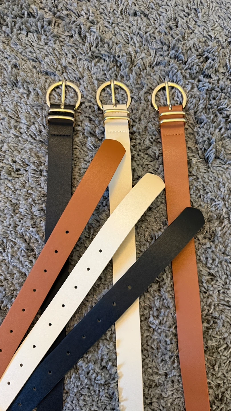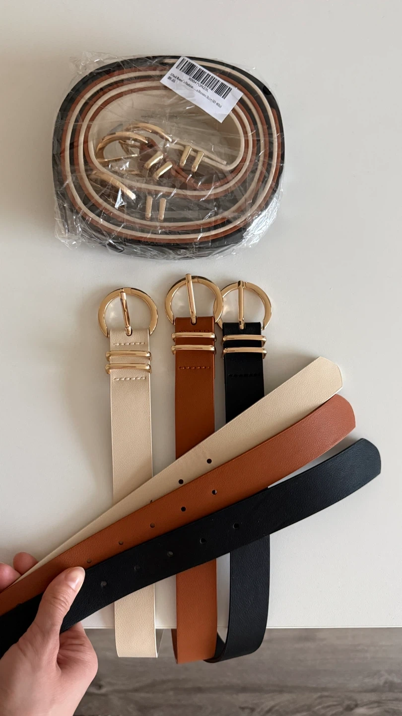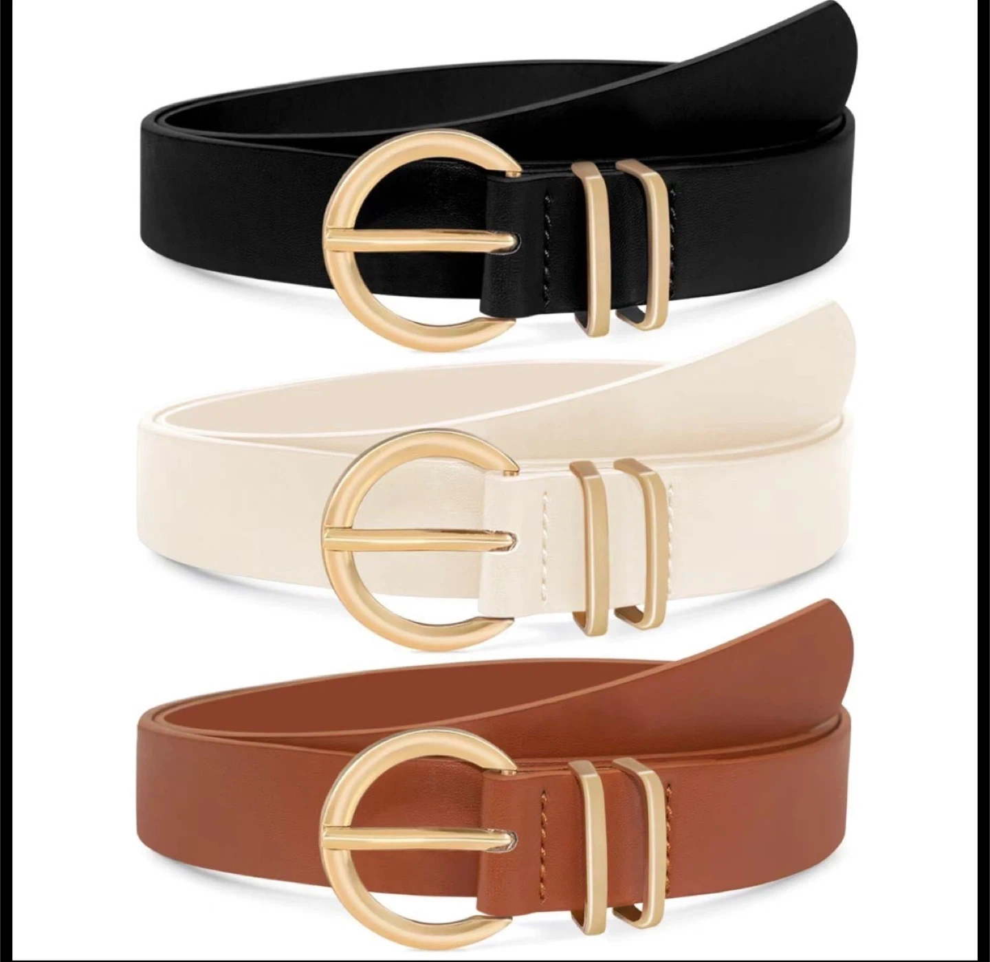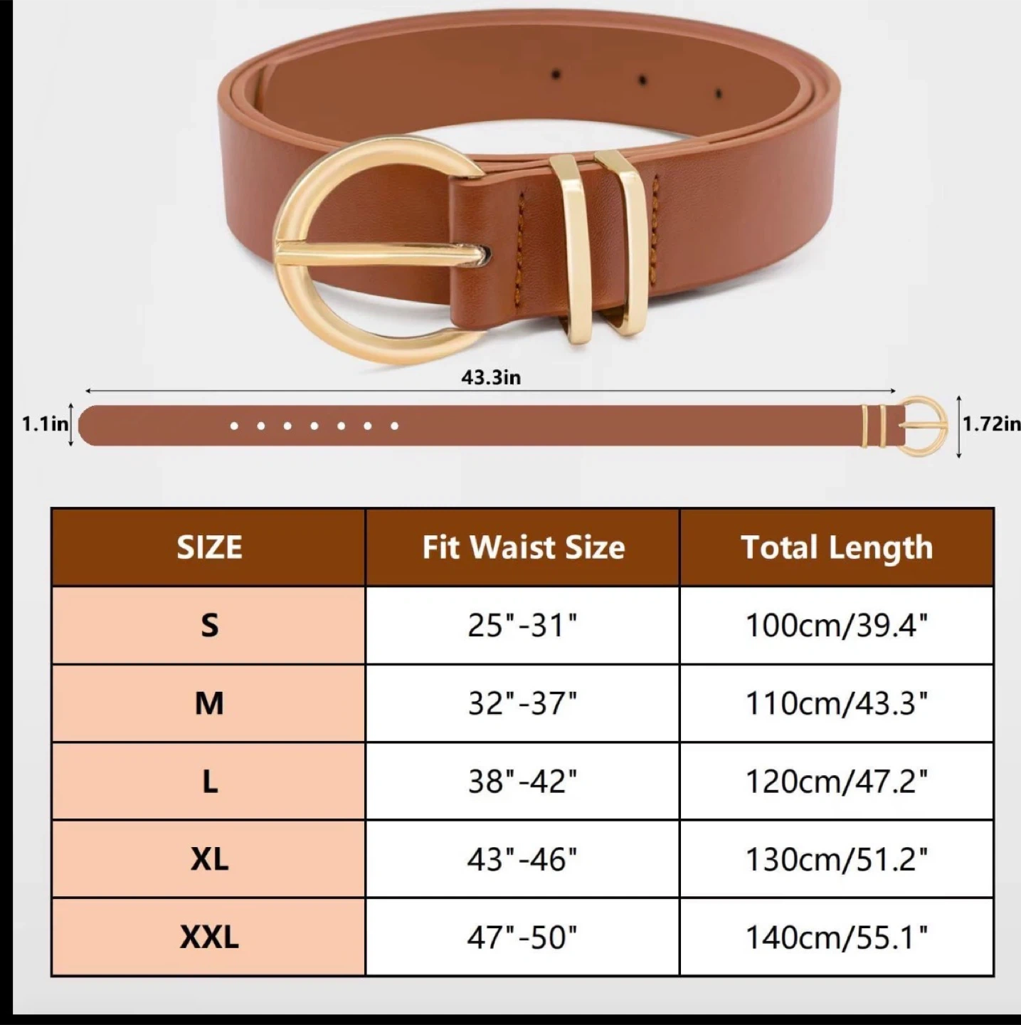 Comes with three fashion belts in black, cream, and brown. Each belt is 1.1 inches wide with a gold-toned buckle. Includes sizing chart for fit reference.