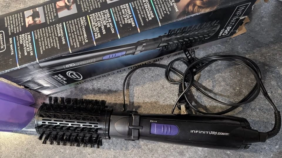 This Infinitipro hot air brush features ceramic and ionic technology to safely dry hair, promote health, reduce frizz, and enhance shine. It's in great condition, clean, and working. No damages or scratches!