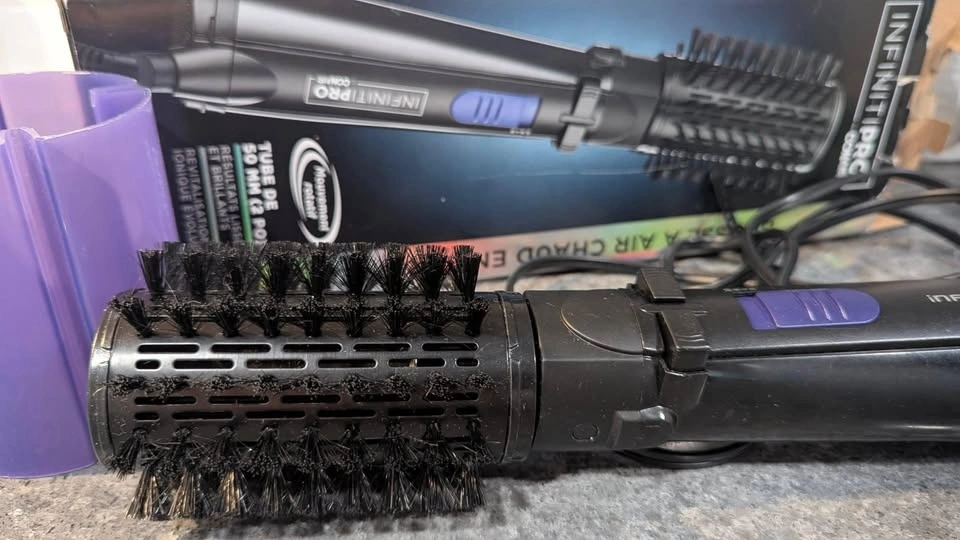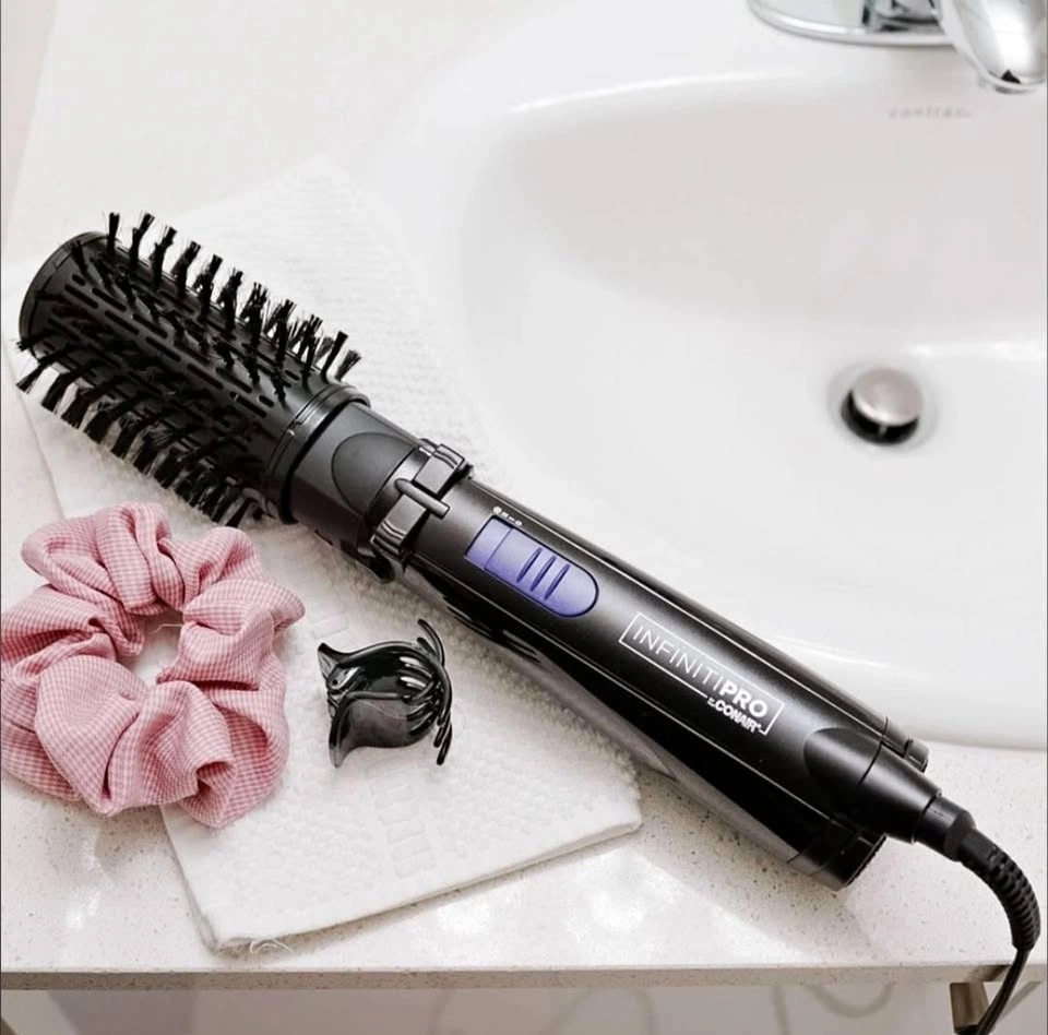This Infinitipro hot air brush features ceramic and ionic technology to safely dry hair, promote health, reduce frizz, and enhance shine. It's in great condition, clean, and working. No damages or scratches!