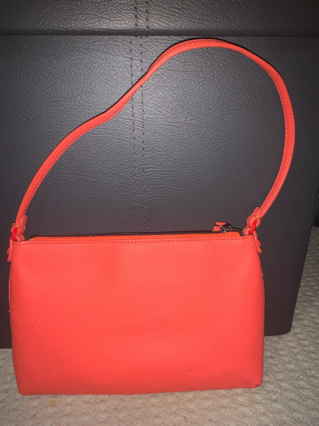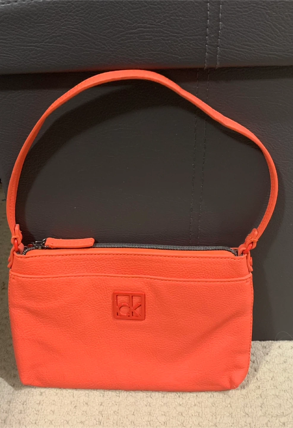 This is a Calvin Klein orange wristlet pouch. It's made of faux leather and has a zippered closure. There's an exterior slip pocket for quick access. This pouch is perfect for carrying essentials when you don't need a full-sized bag.