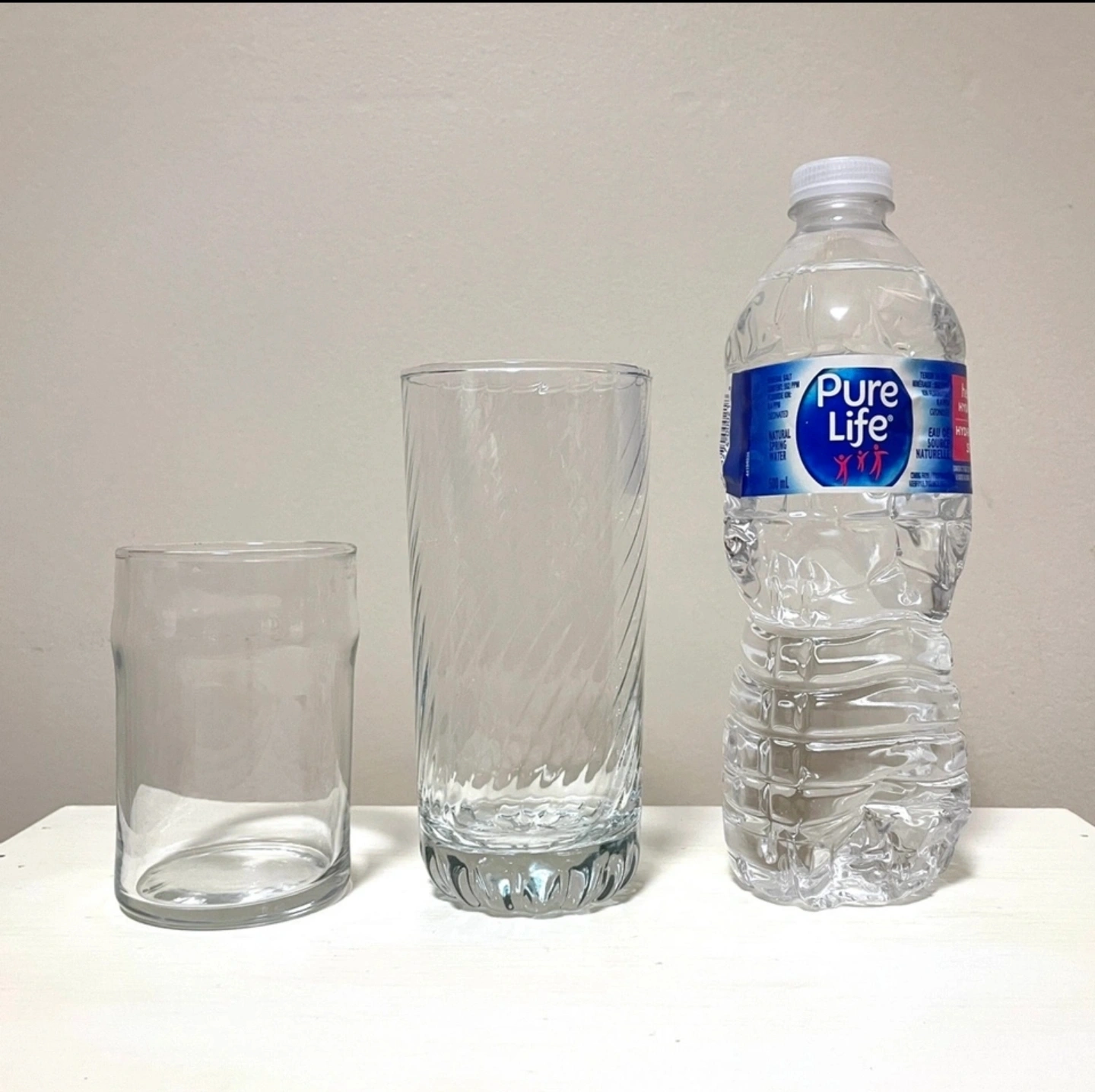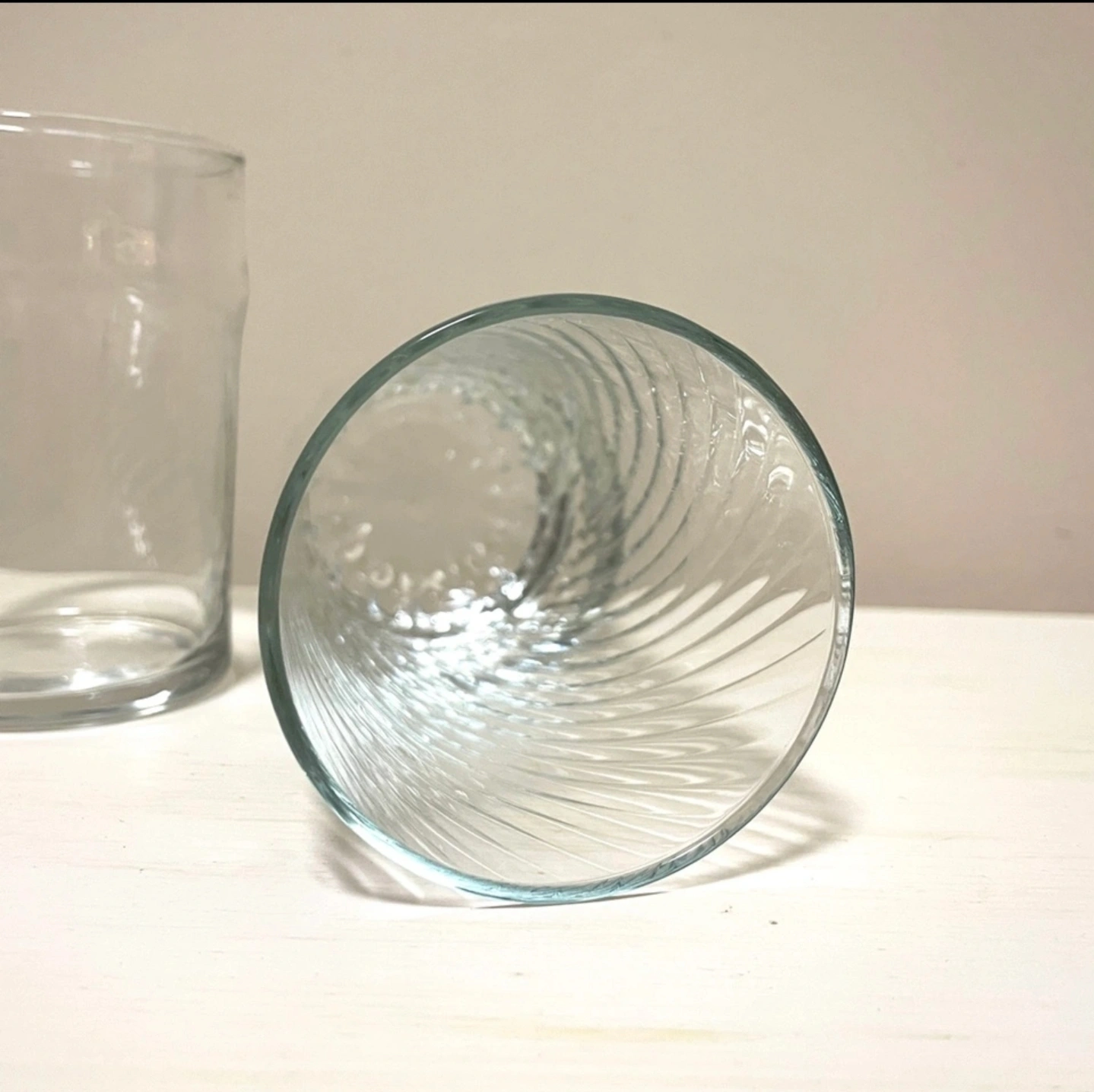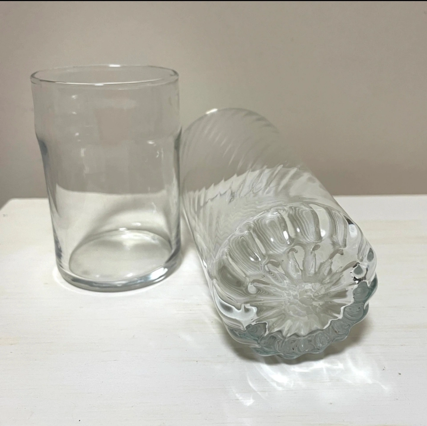 The tall glasses have a swirl pattern, and both are made of clear glass.