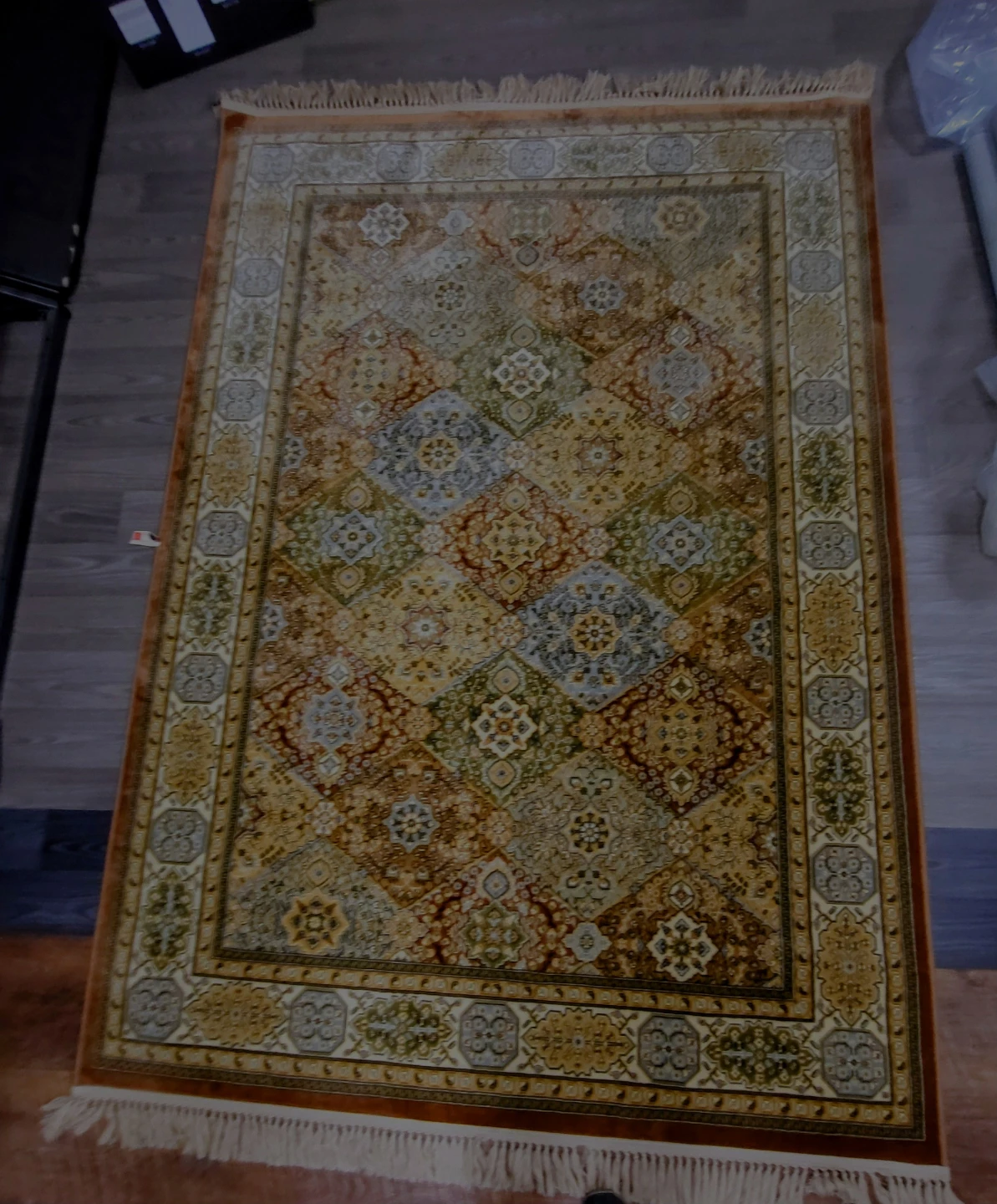 Selling a NEW beautiful area rug with a detailed pattern and design. The rug has a warm, inviting colour palette. Original price at $350.