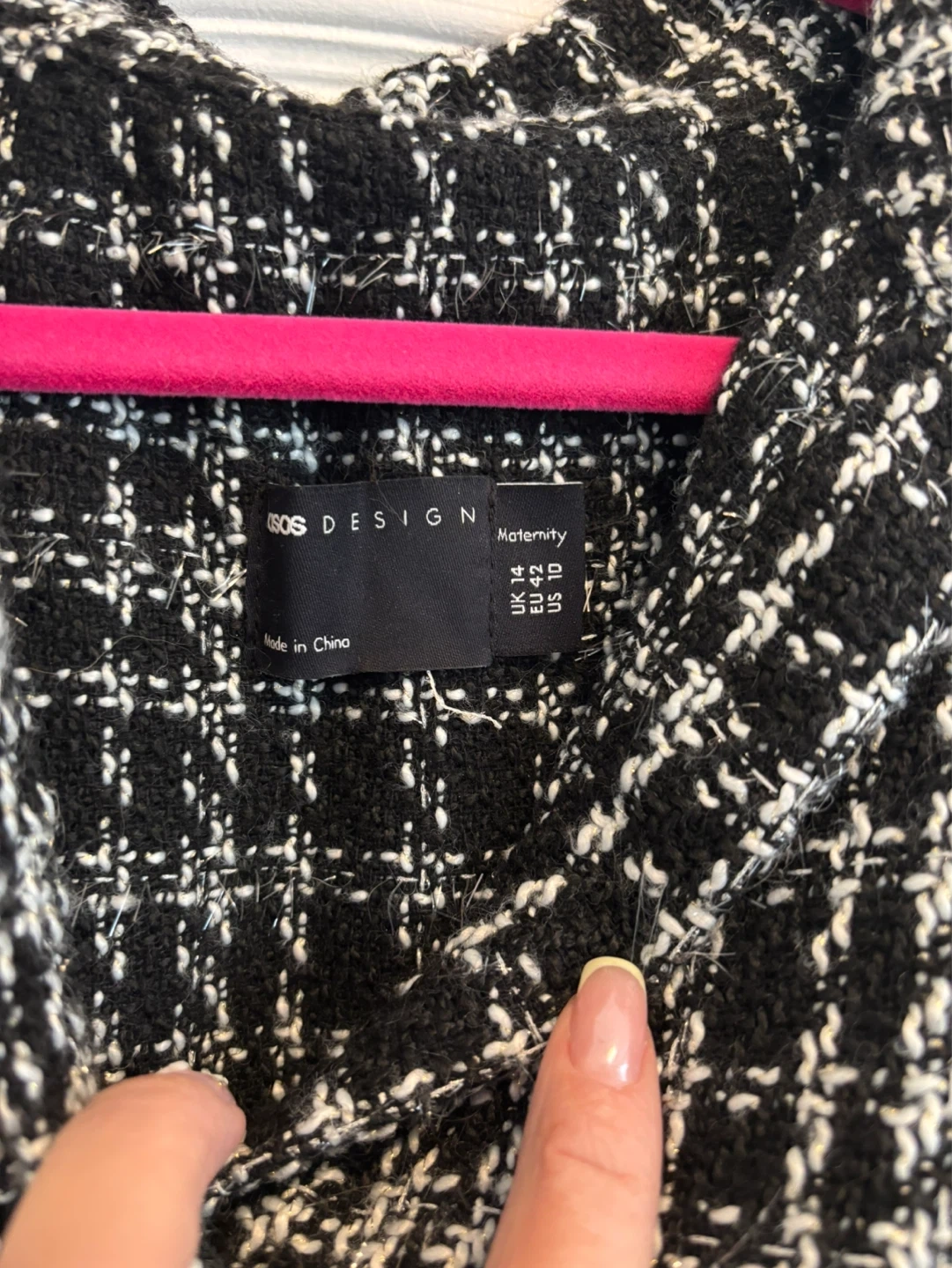 This ASOS DESIGN maternity dress comes in a black and white tweed pattern. It features a collared neckline and a tie belt at the waist. This dress is a size UK 14, EU 42, US 10.