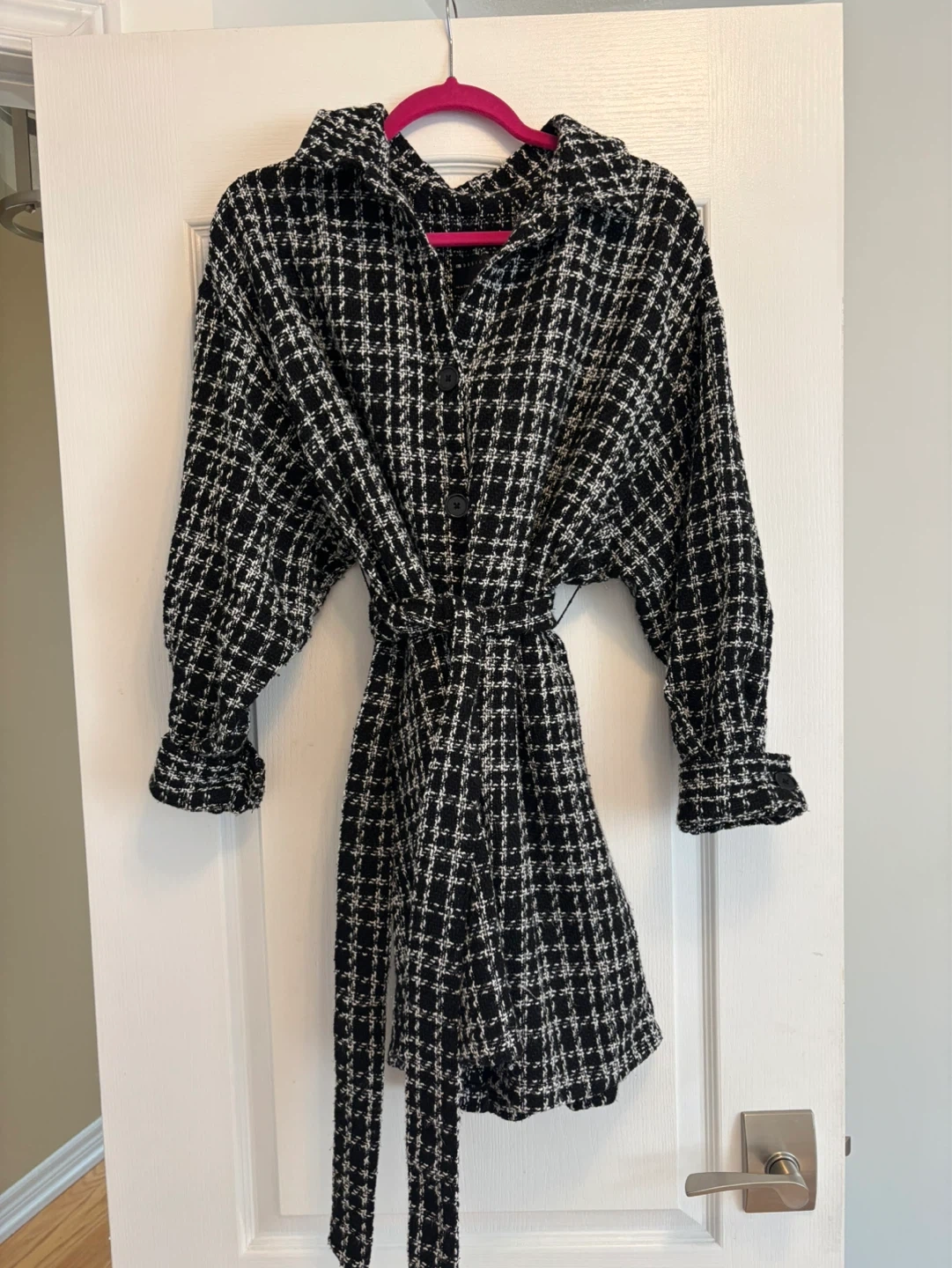 This ASOS DESIGN maternity dress comes in a black and white tweed pattern. It features a collared neckline and a tie belt at the waist. This dress is a size UK 14, EU 42, US 10.