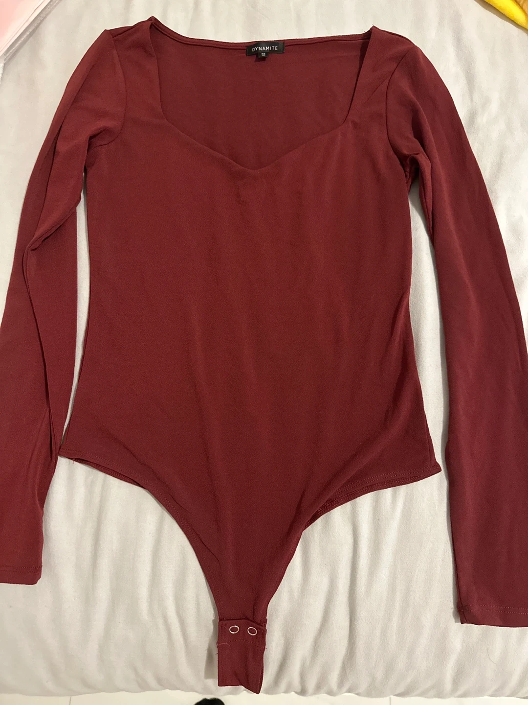This is a DYNAMITE long sleeve bodysuit. It features a flattering square neckline and a snap closure at the crotch. The material is soft and stretchy.