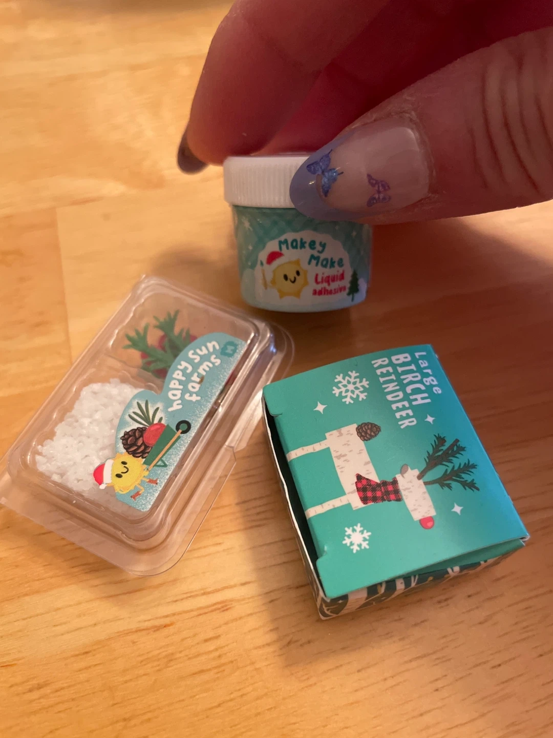 Makey Make liquid adhesive in a small pot with a Christmas theme. Includes a clear container with white craft snow and a 'Happy Sun Farms' sticker. Also comes with a small box titled 'Large Birch Reindeer'. Great for holiday crafts!
