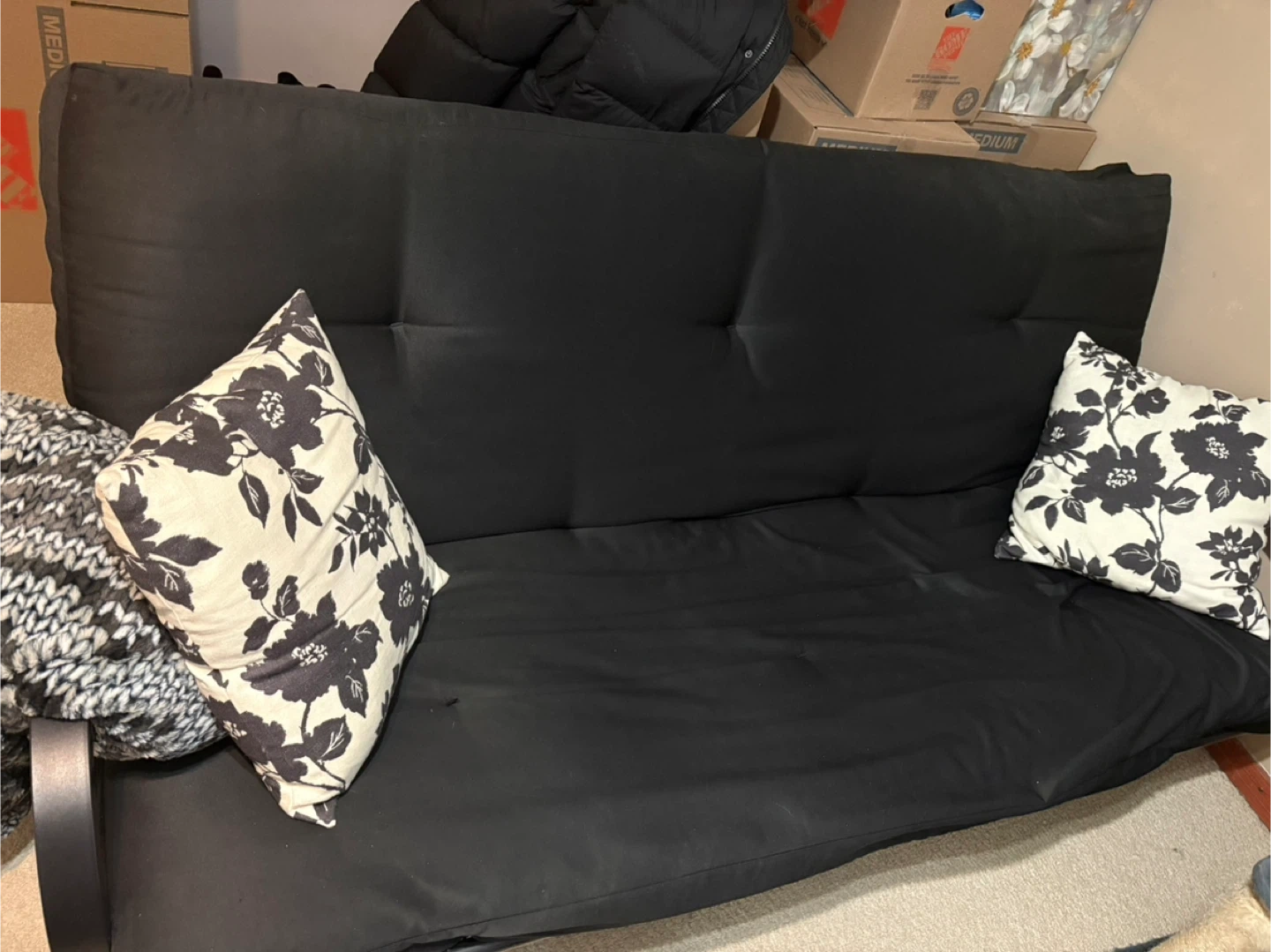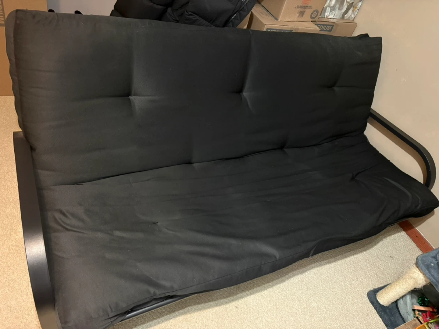 This black futon sofa bed offers a comfortable seating and sleeping solution. It's made with a durable fabric and features a metal frame for stability. This versatile piece is great for small spaces or as an extra bed for guests.