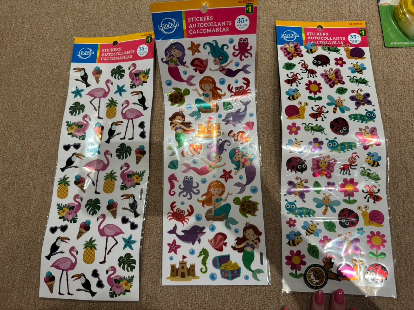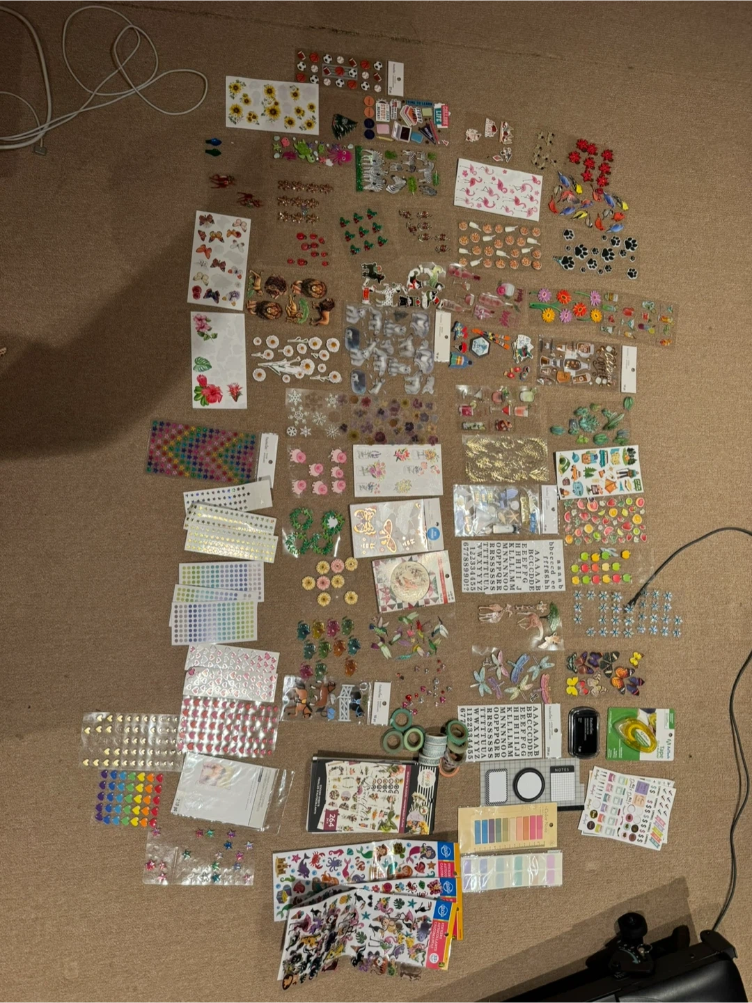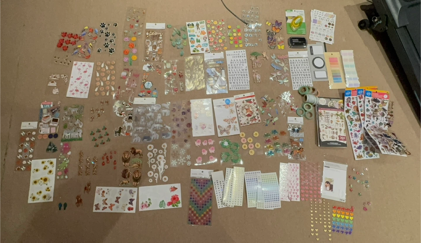 This lot includes a wide variety of stickers, decorative tape, photo corners, an ink pad, and a tape glue runner. Stickers feature themes like flowers, animals, letters, and planner designs. All items are new or in excellent condition, perfect for scrapbooking, journaling, and other crafts. Supplies are from brands like Recollections and AdTech.
