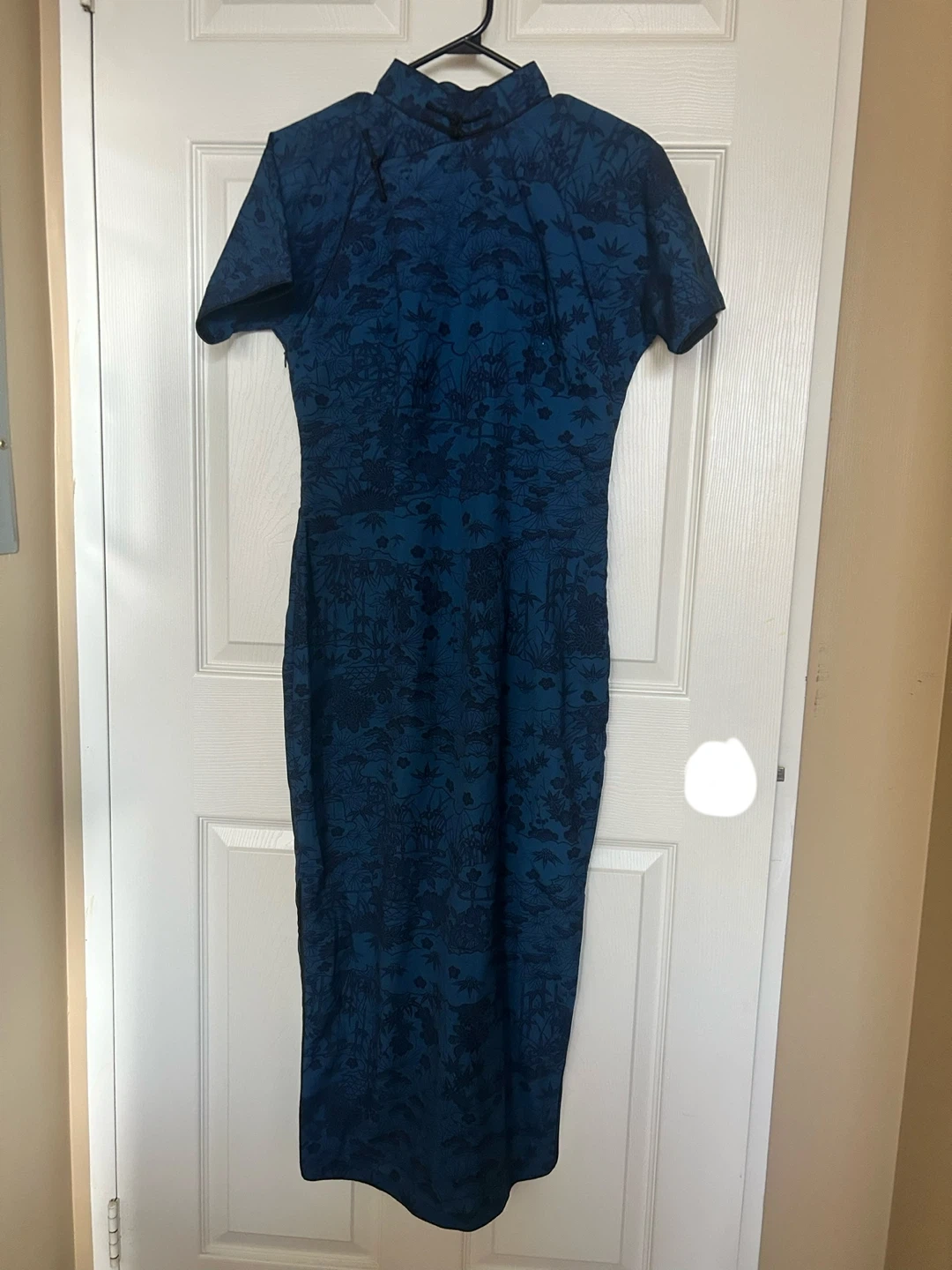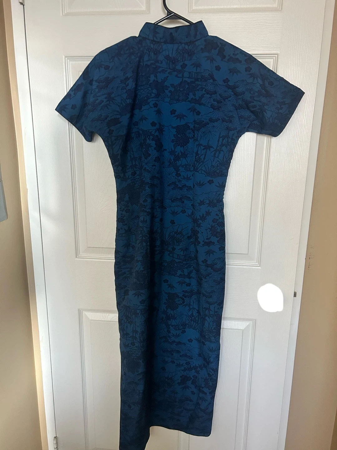 This is a beautiful blue qipao with a unique pattern. the fabric is cotton. It's in great condition and ready for a new home! Tried on for few times, never wear it outside . Labeled size XL but fits like S.