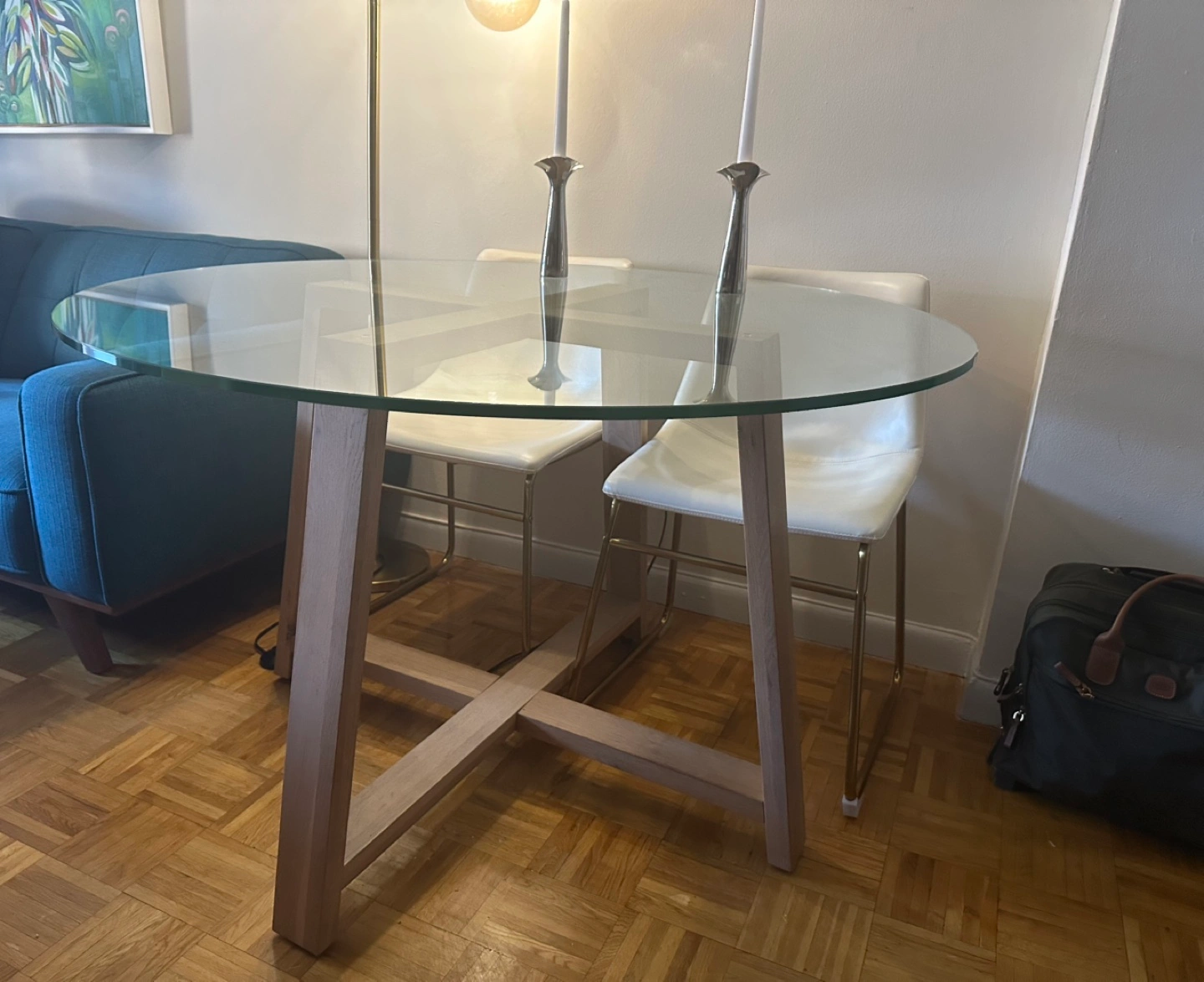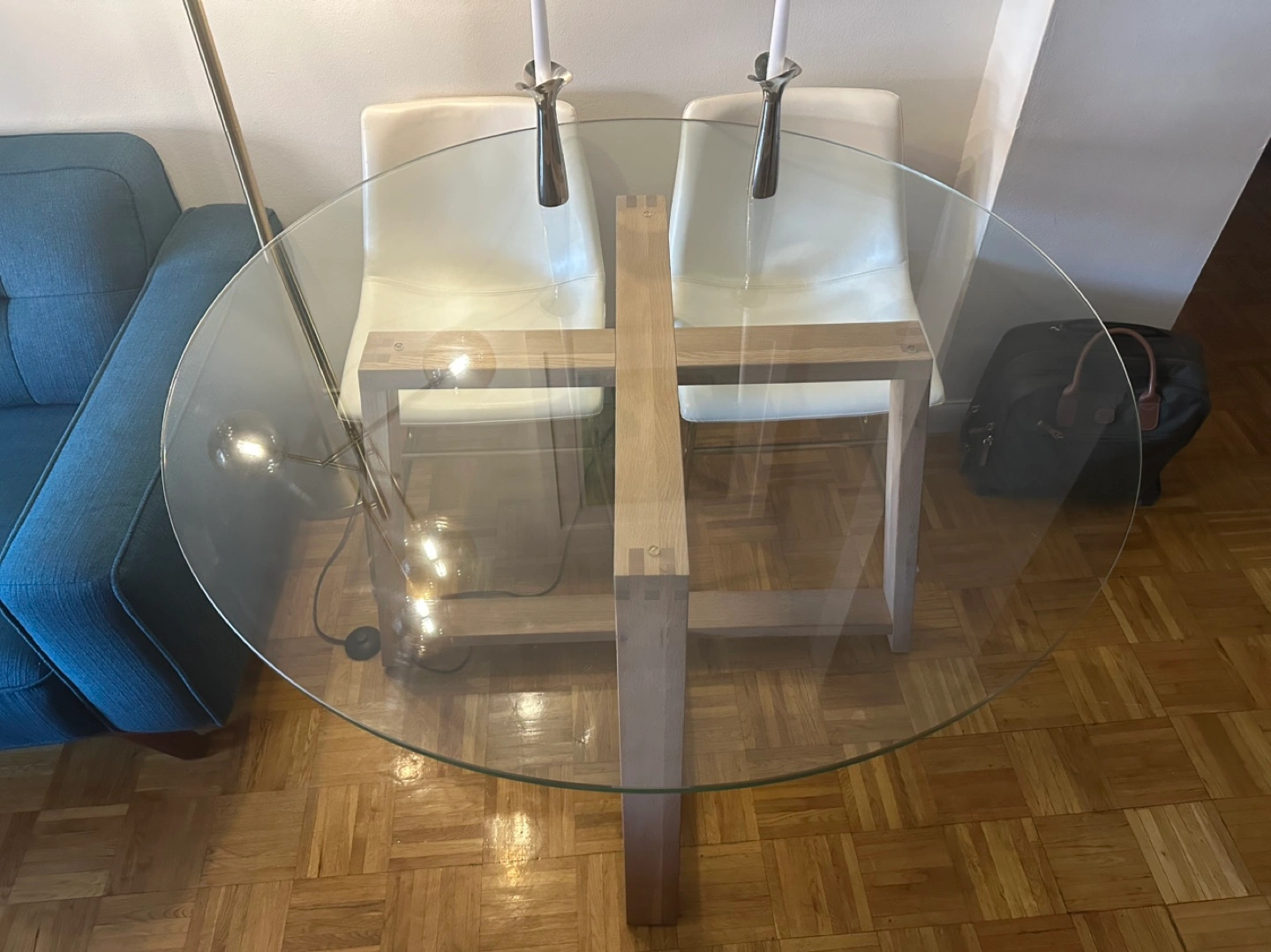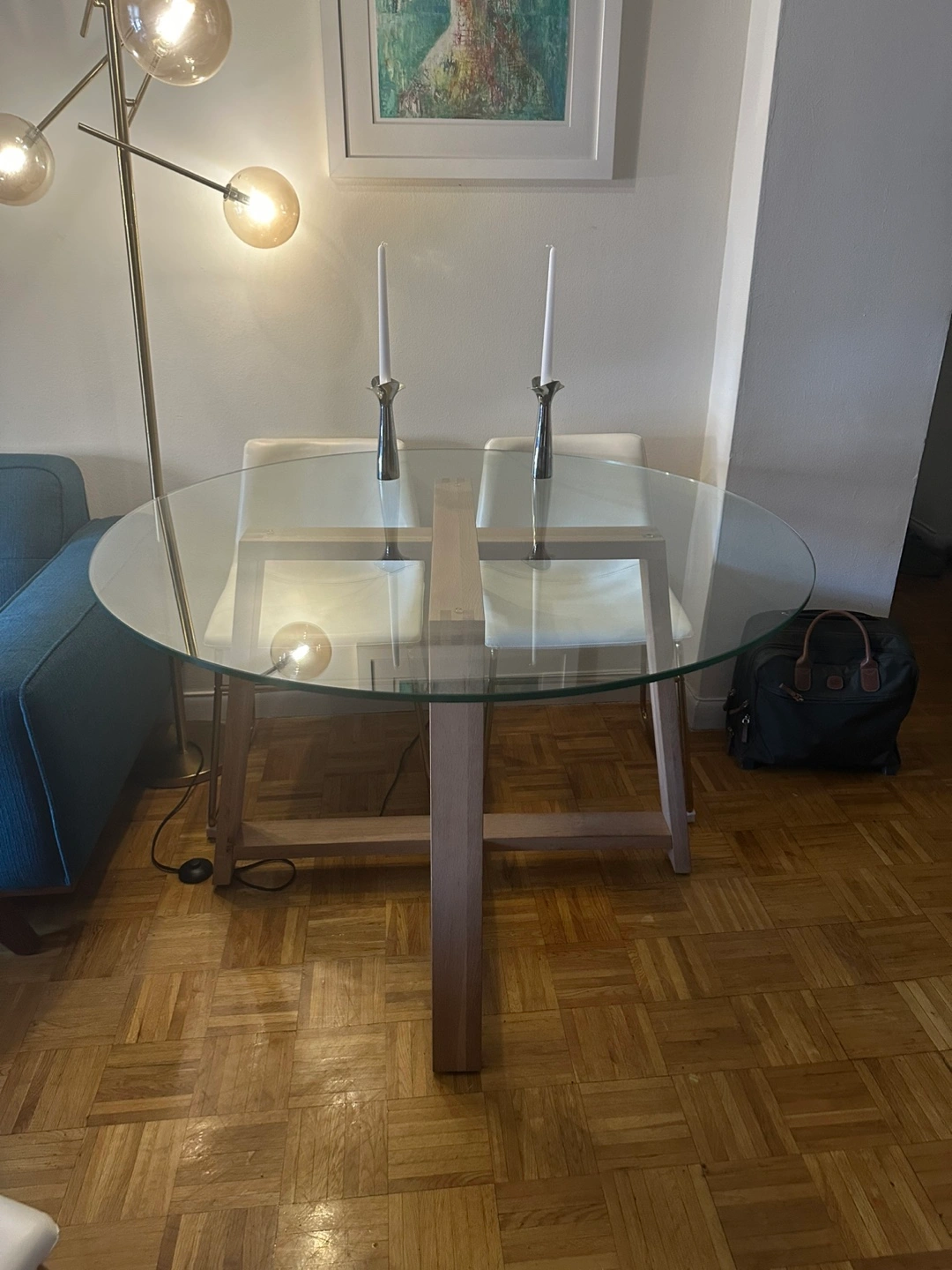 Small round glass top dining table. Wooden base. Simple design. Perfect for a small apartment or breakfast nook. Small scratch on glass. Must be able to pick it up.