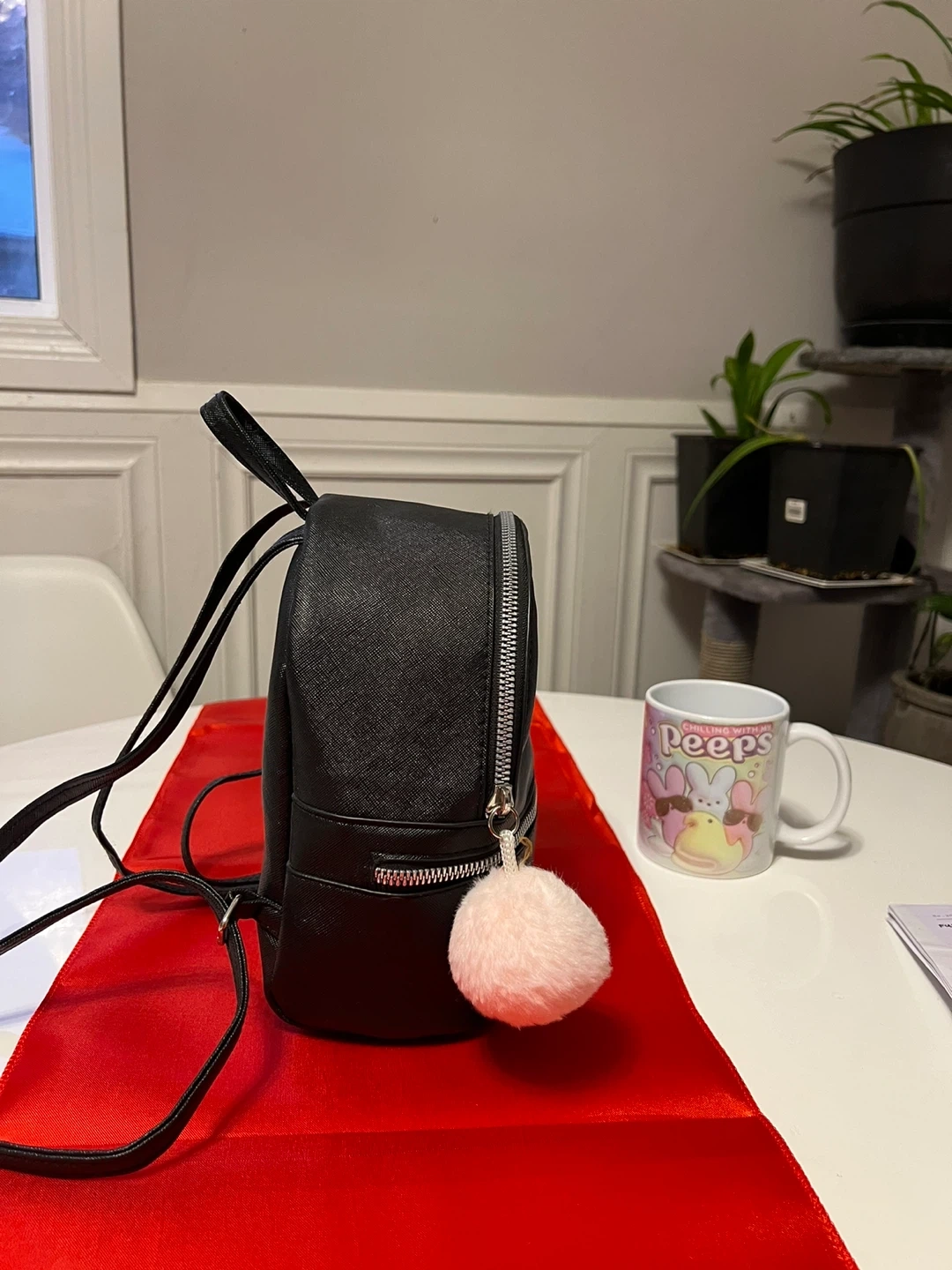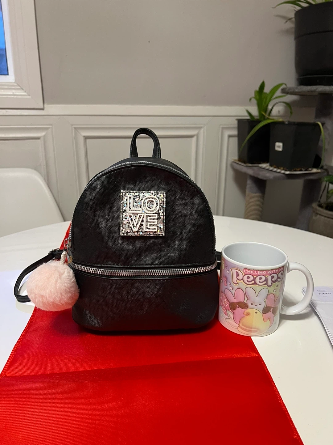 This black mini backpack features a sparkly "LOVE" embellishment on the front. It comes with a detachable pink pom-pom charm. Its compact size makes it perfect for carrying essentials. Excellent condition.