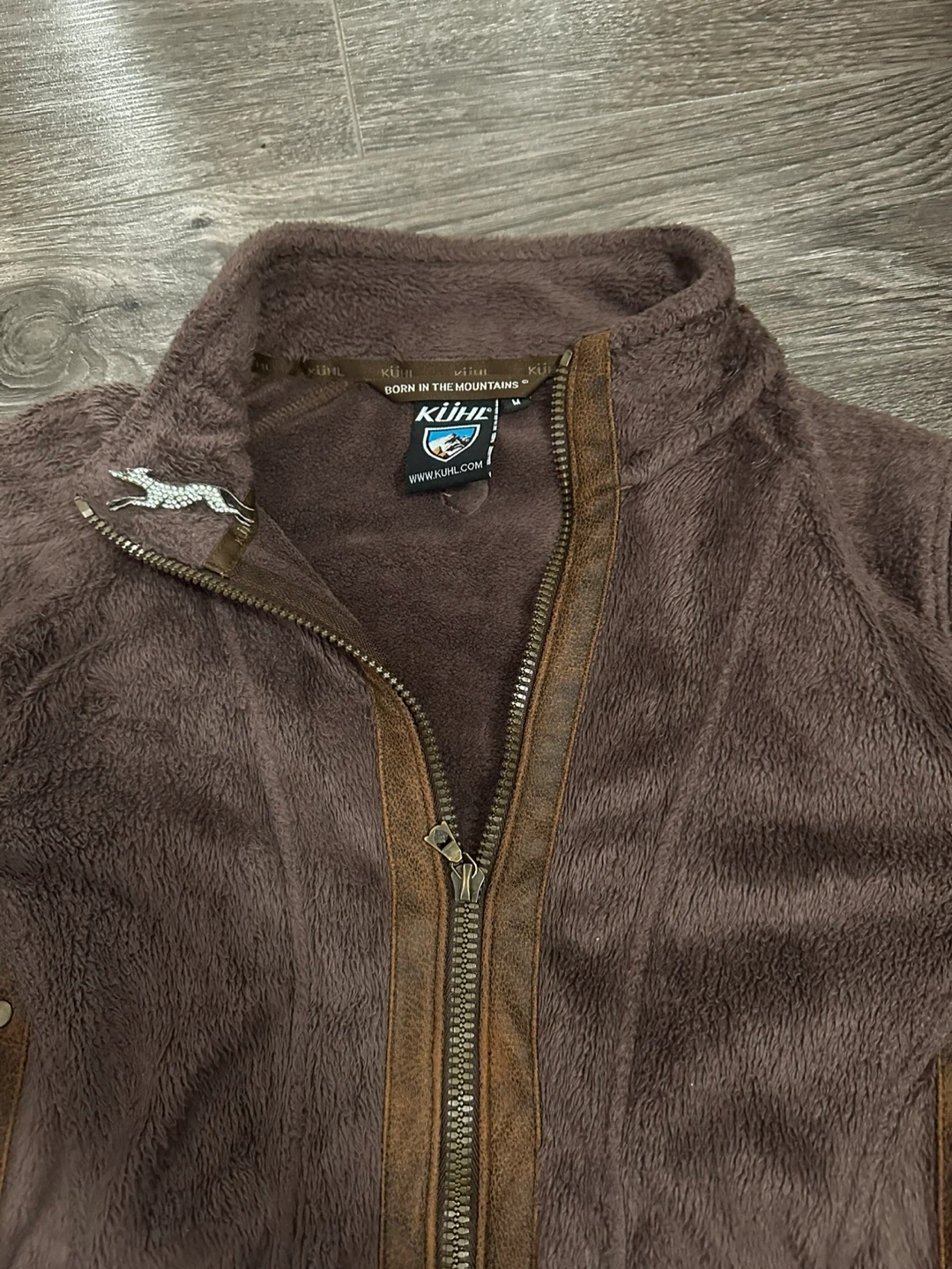 This Kuhl fleece jacket is brown and size medium. It features a full zip front with brown faux leather accents. It's made from a soft, cozy fleece material perfect for cooler weather.