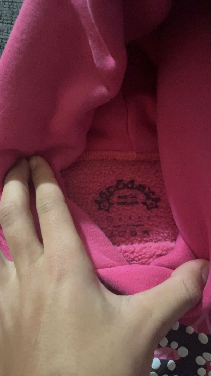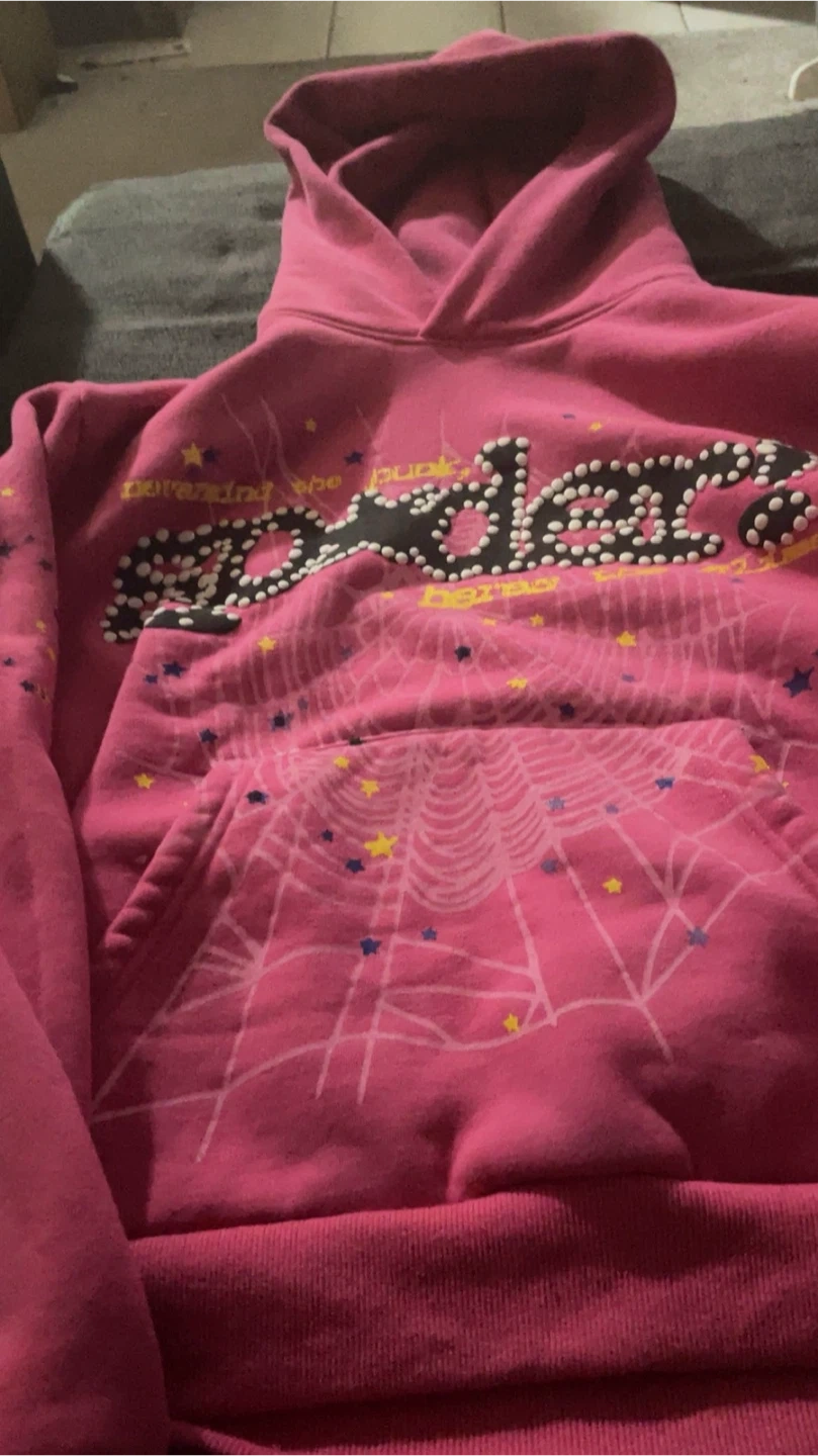 Selling a pink Spider hoodie in size small. It features a spiderweb design on the front and stars on the front and back. It's in great condition!