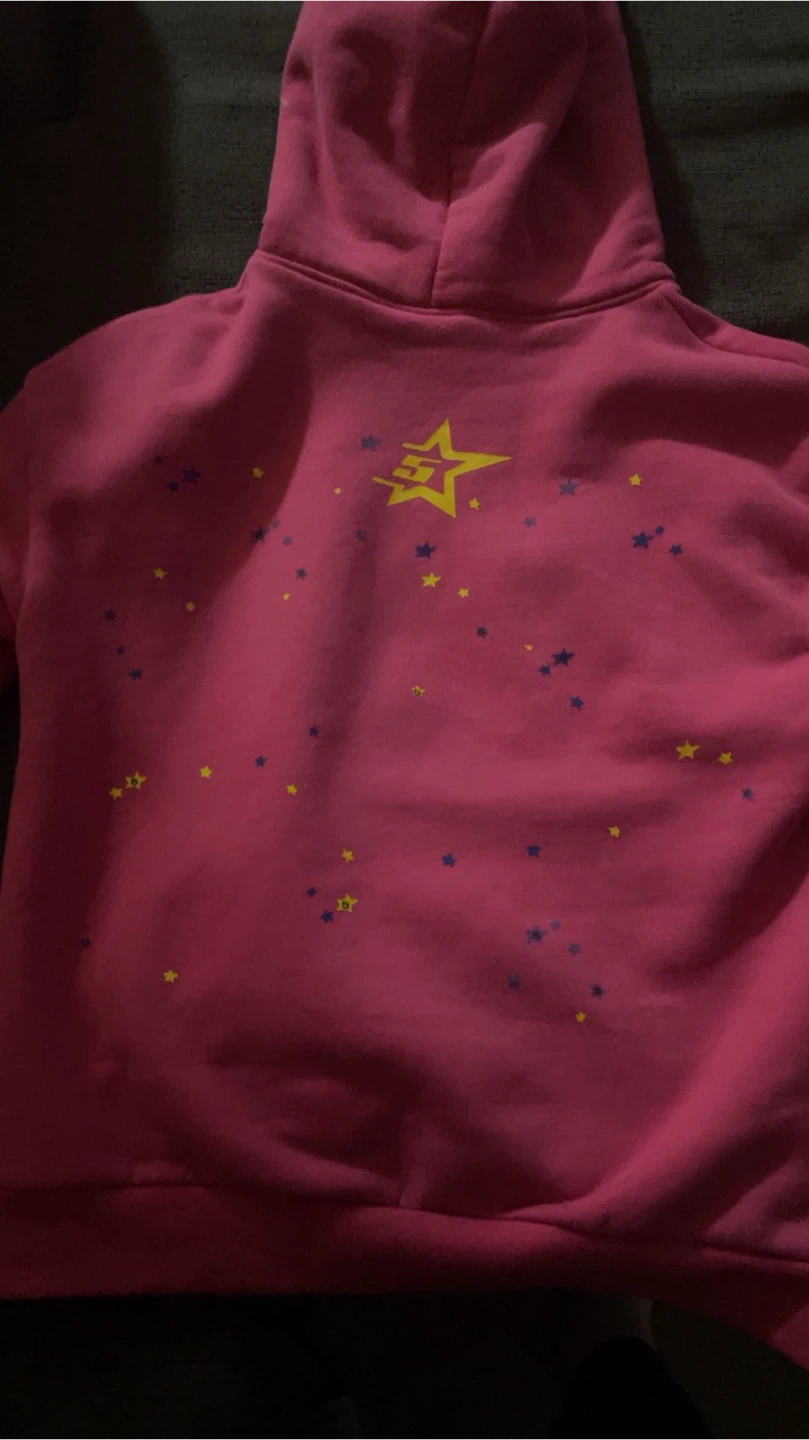 Selling a pink Spider hoodie in size small. It features a spiderweb design on the front and stars on the front and back. It's in great condition!