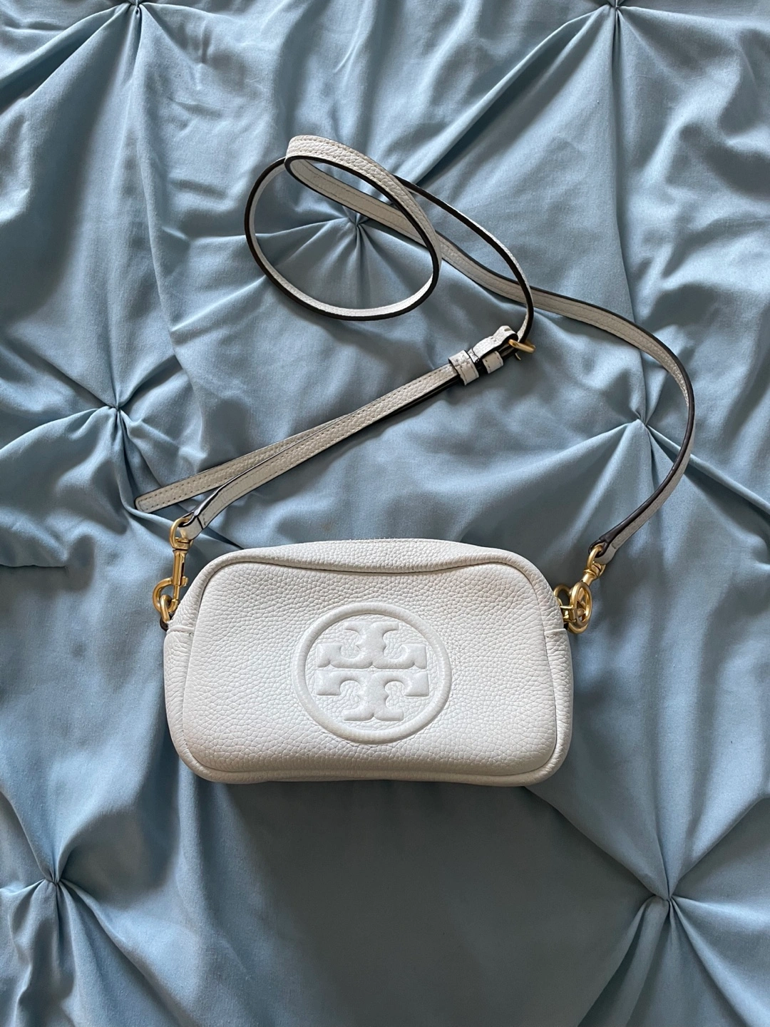 Selling a cute Tory Burch crossbody bag! It's a stylish and versatile accessory in white leather. Perfect for everyday use or a night out. It's in good condition and ready for a new home!