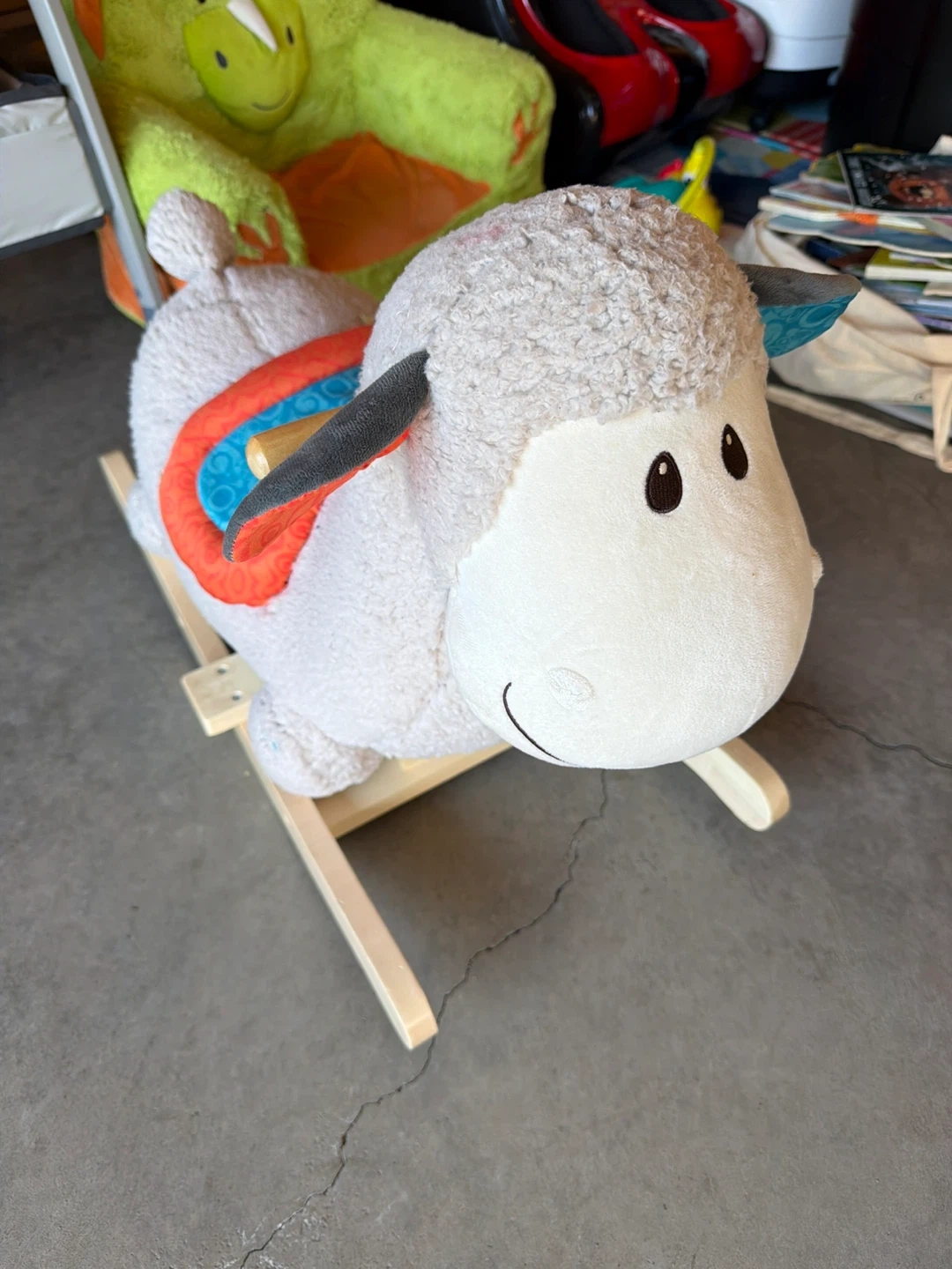 This adorable plush sheep rocking toy is super soft and ready for hours of fun! It features a comfortable saddle and a sturdy wooden base for smooth rocking. Its huggable design makes it a cozy companion for little ones.