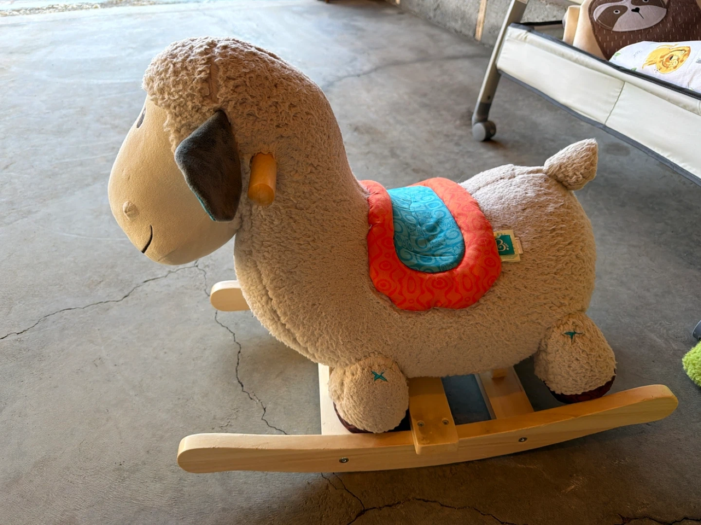 This adorable plush sheep rocking toy is super soft and ready for hours of fun! It features a comfortable saddle and a sturdy wooden base for smooth rocking. Its huggable design makes it a cozy companion for little ones.
