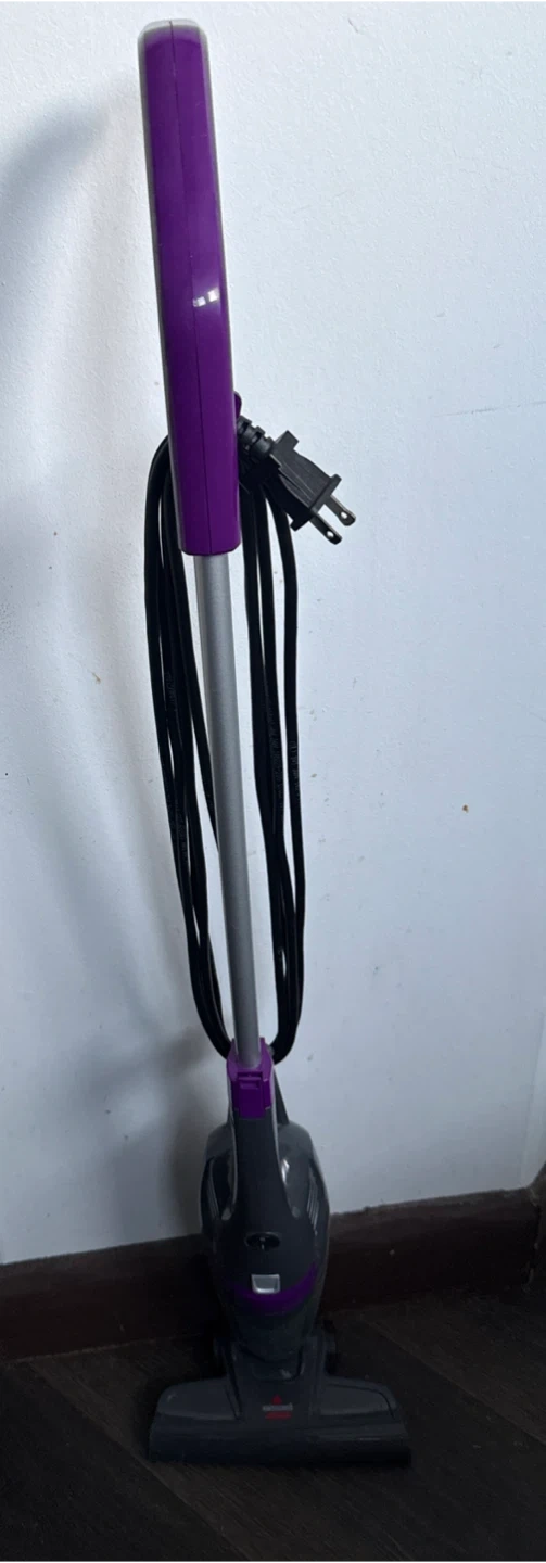 This is a purple and grey Bissell stick vacuum cleaner. It's corded and comes with its power cord. It's a handy vacuum for quick cleanups! ONLY PICK UP