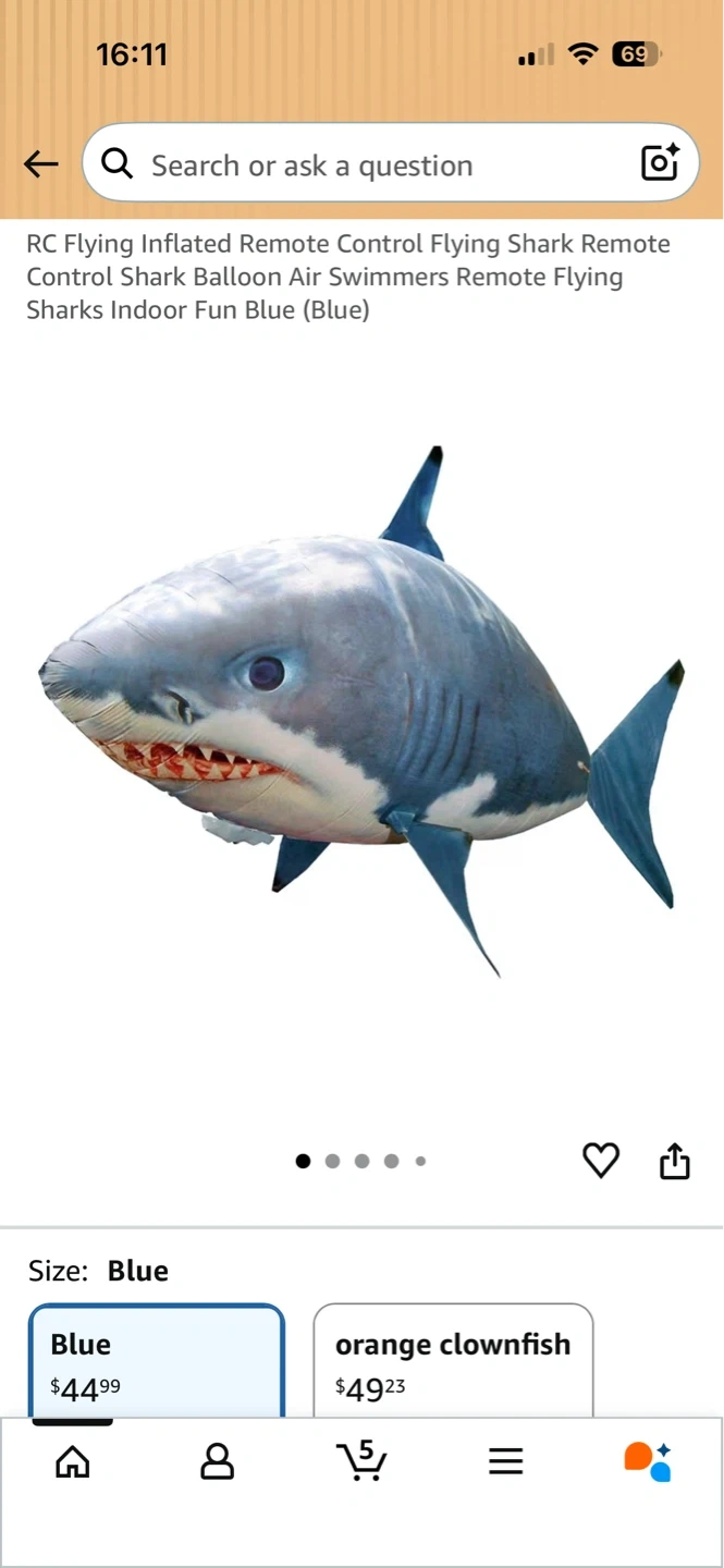 This is a blue RC flying inflatable shark balloon. It's controlled by remote and designed for indoor fun. It comes with the remote and instructions.
