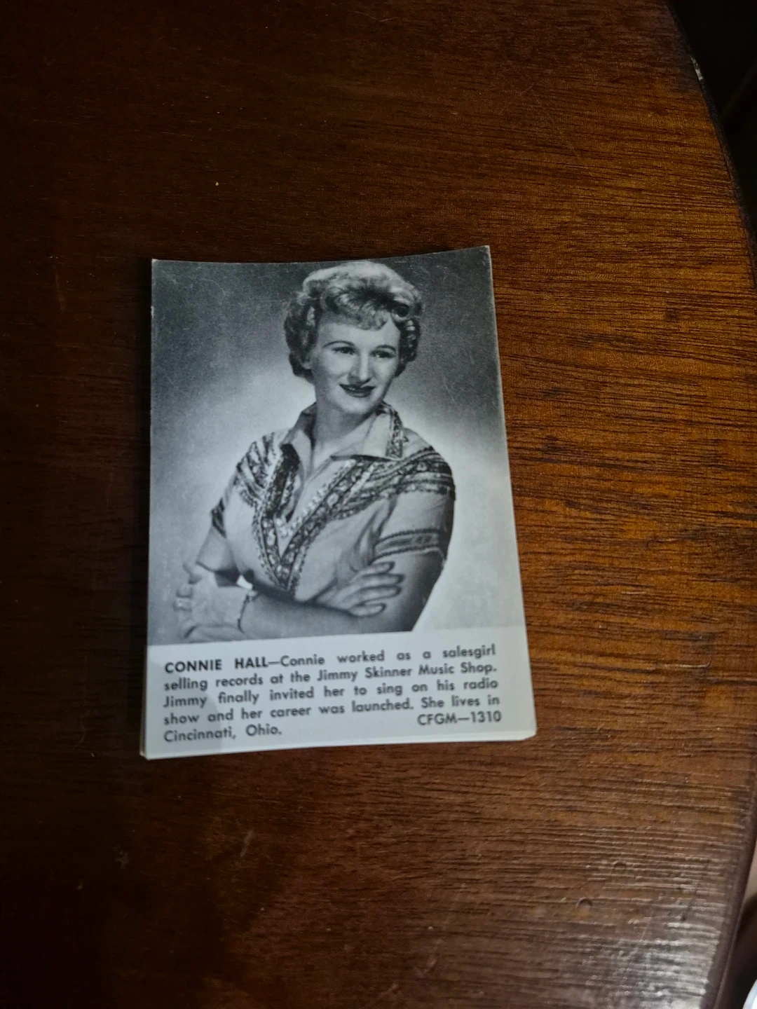 This is a vintage photograph of Connie Hall, who worked as a salesgirl at Jimmy Skinner Music Shop. Jimmy invited her to sing on his radio show, launching her career. She lived in Cincinnati, Ohio.