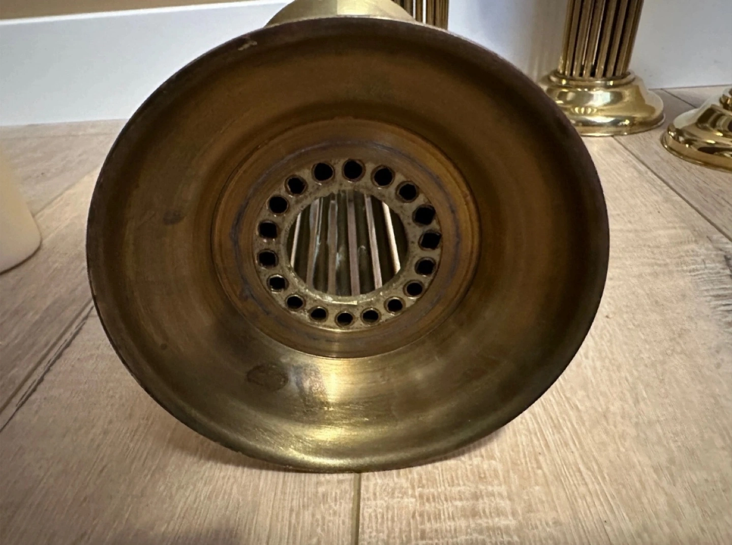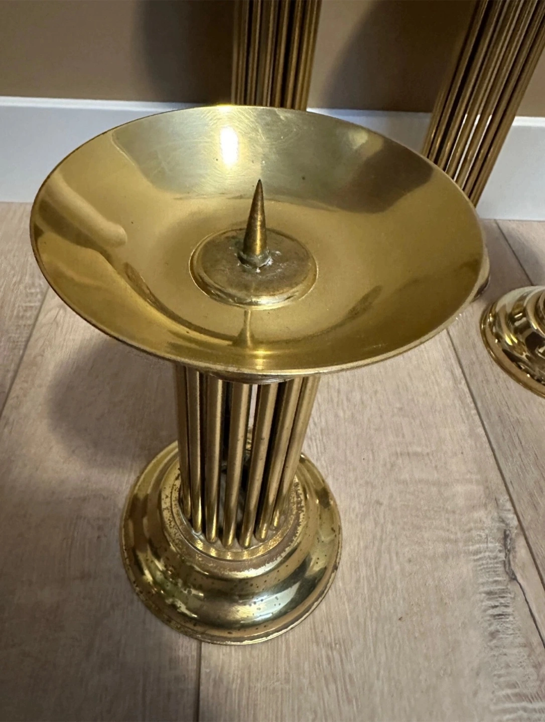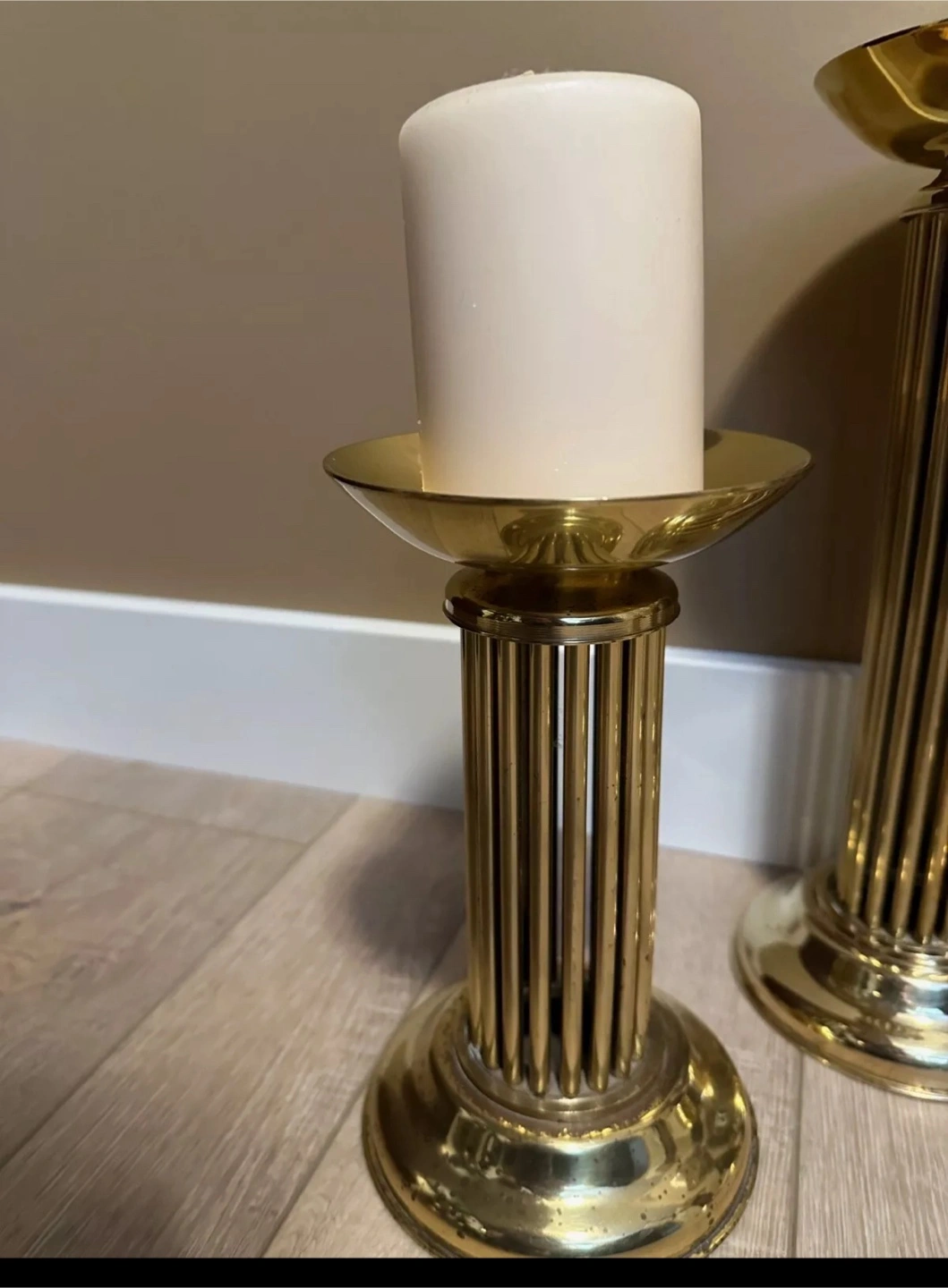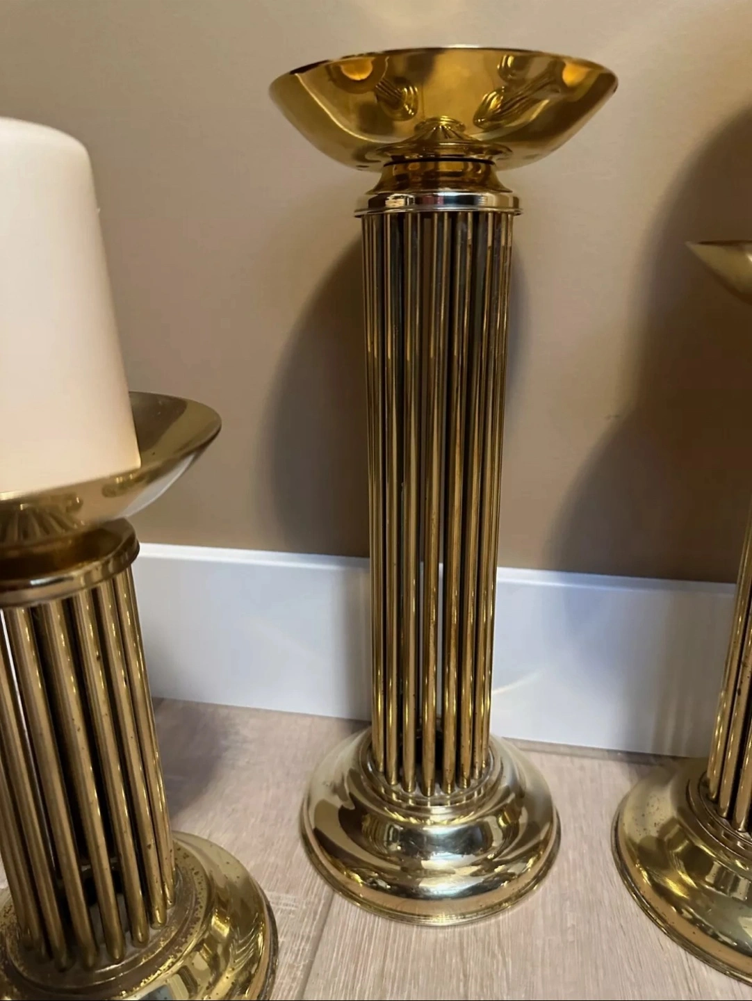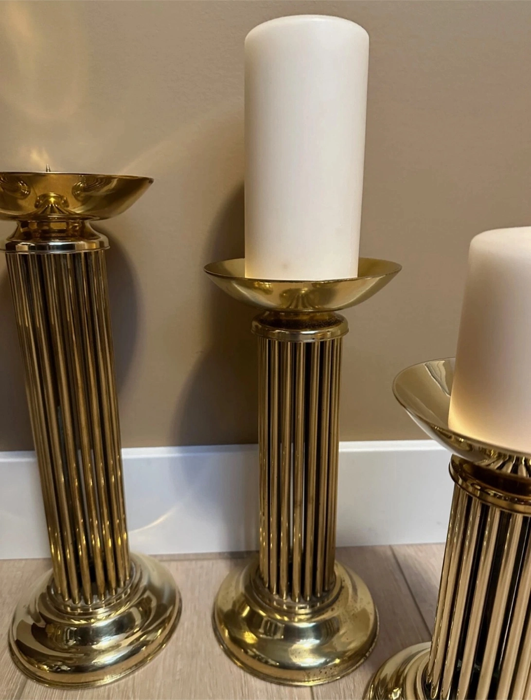 Four elegant brass candle holders. Fluted column design. Perfect for adding a touch of sophistication to your home décor. Candles included if you want them.
