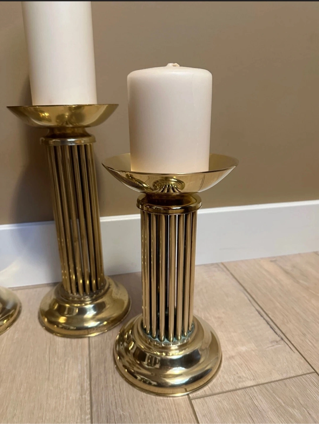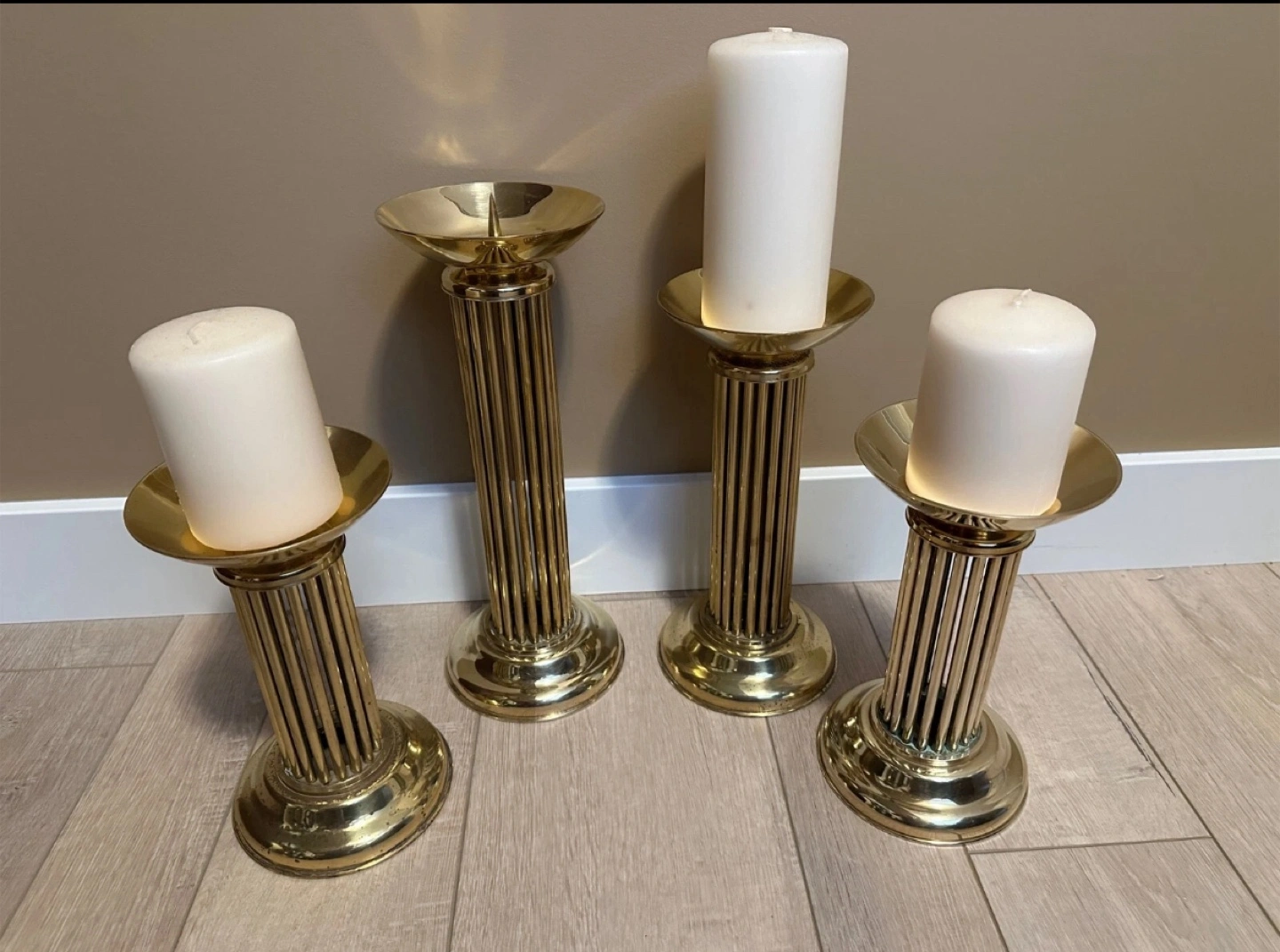 Four elegant brass candle holders. Fluted column design. Perfect for adding a touch of sophistication to your home décor. Candles included if you want them.