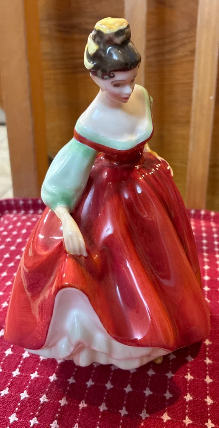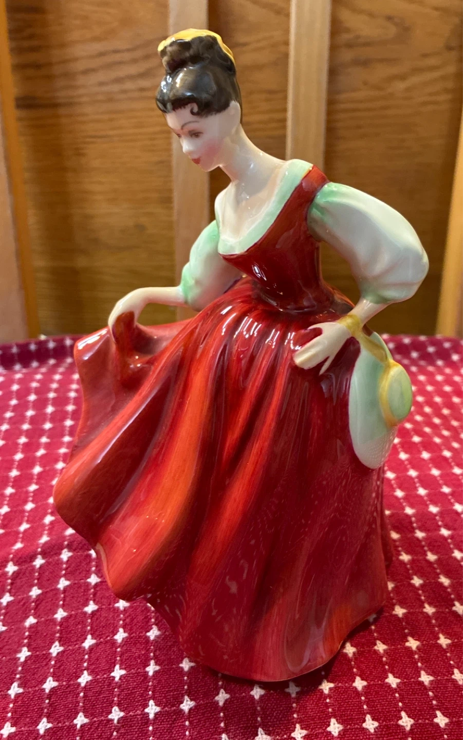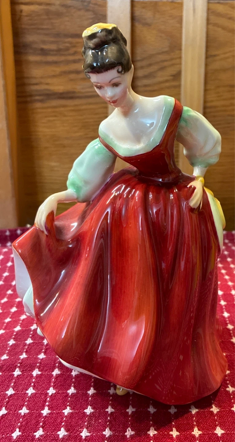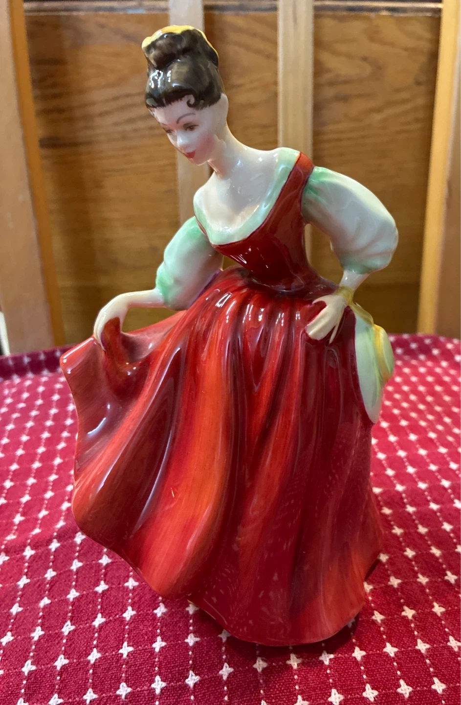 This is a Vintage 1962 Royal Doulton figurine titled “Fair Lady” and model number HN 2832 It's a beautiful porcelain piece depicting a lady in a red dress.