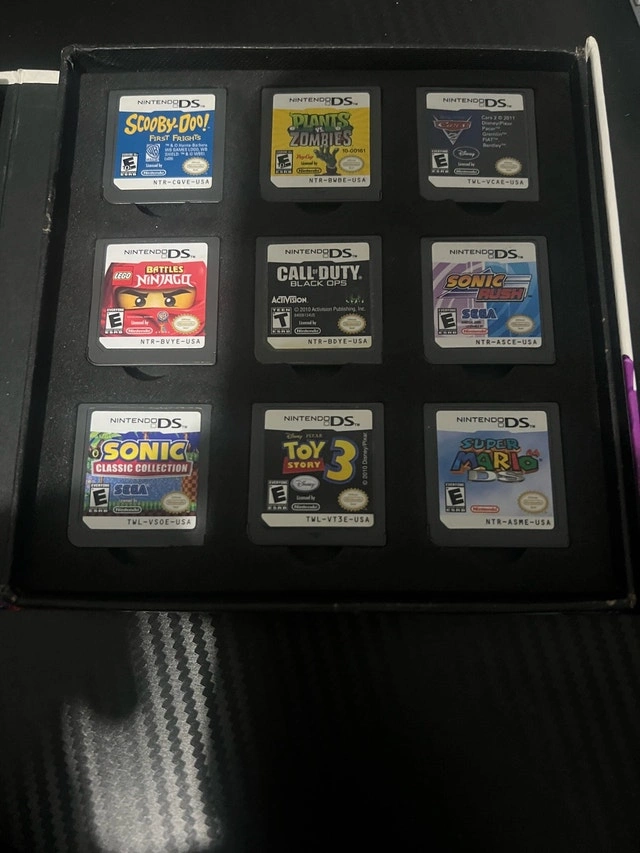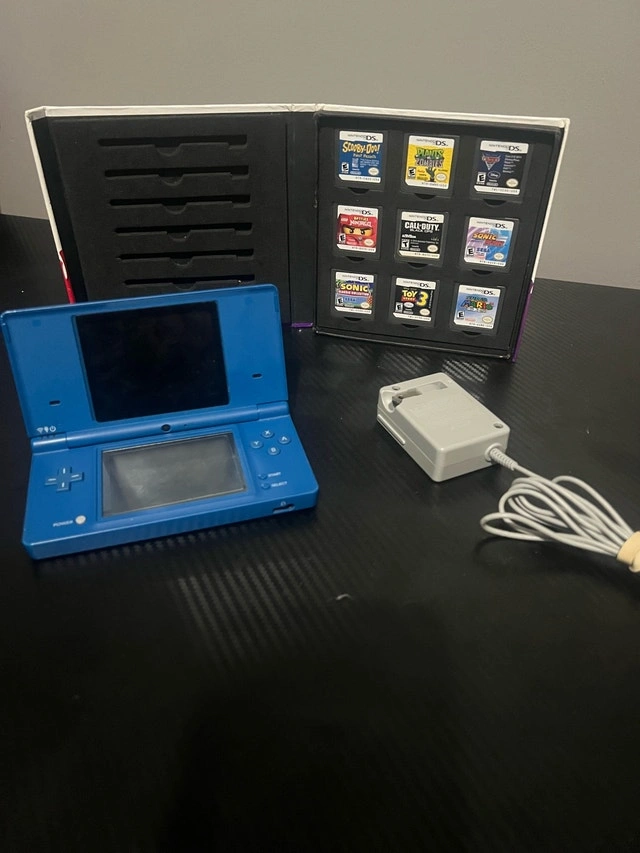 Selling a used blue Nintendo DS bundle. It comes with a charger, a case, and nine games: Scooby Doo, Plants vs Zombies, Cars, Lego Ninjago, Call of Duty, Sonic Rush Adventure, Sonic Classic Collection, Toy Story 3, and Super Mario DS. The console is in good condition and ready for play.