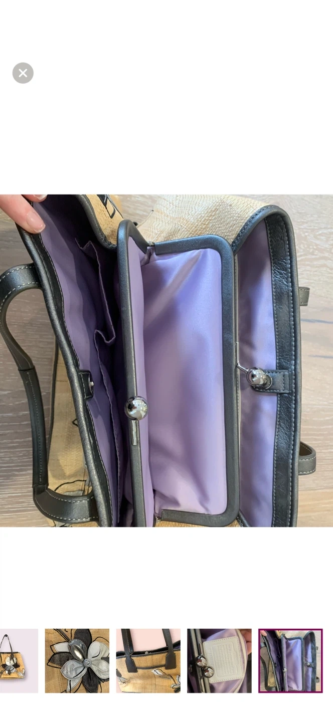 Selling a Coach tote bag with a straw exterior and floral applique design! The interior is a lovely lavender colour. The bag features black leather trim and silver hardware. Perfect for adding a touch of style to your outfit