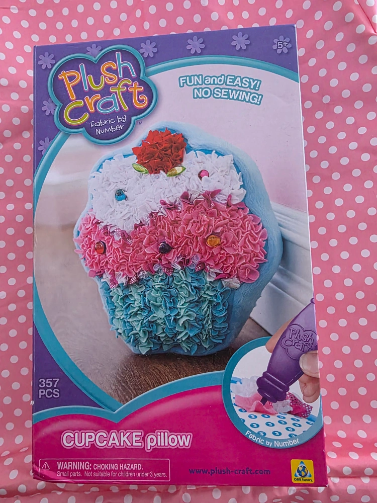 Get crafty with this Plush Craft Cupcake Pillow kit! It's brand new and still in the box. This fun and easy fabric-by-number project requires no sewing and includes 357 pieces to create your own adorable cupcake pillow