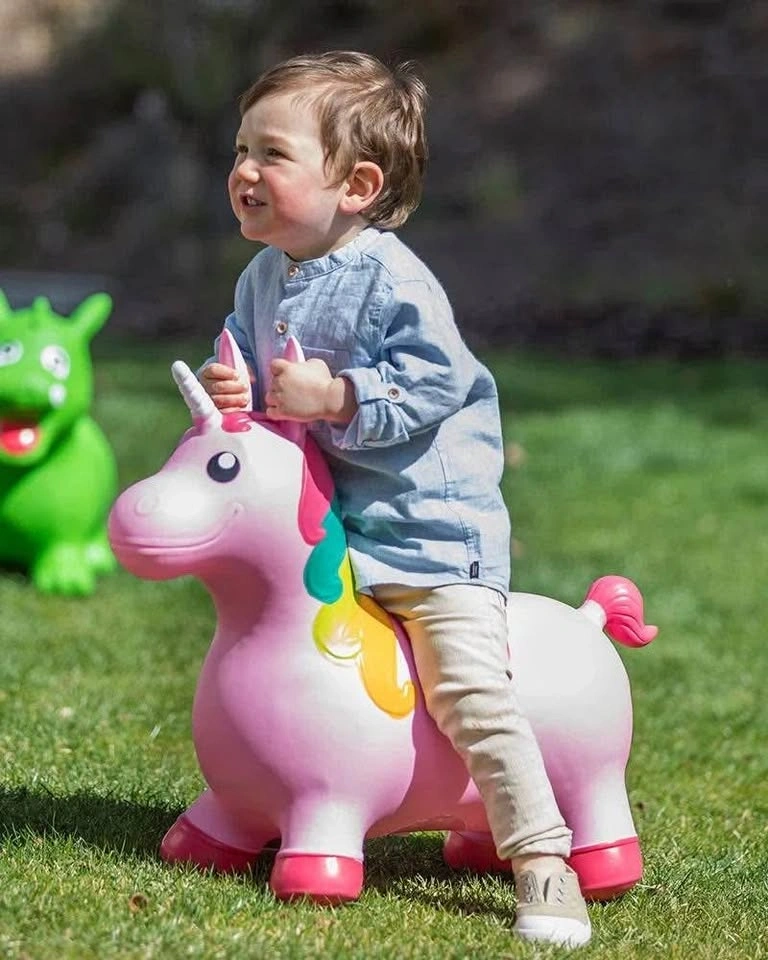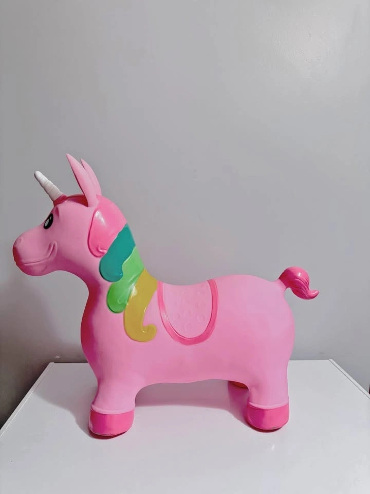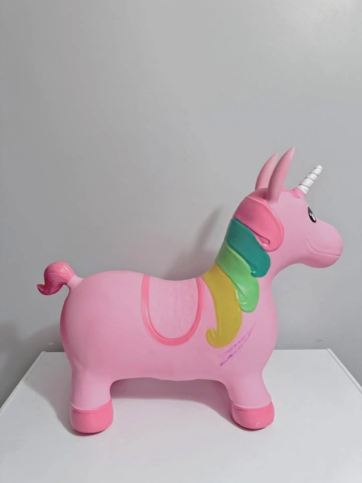 Good condition Mastermind Toys baby ride-on bouncing unicorn (inflatable, pink with rainbow mane). Helps develop balance and gross motor skills. Maximum user weight: 50 kg. There is a small stain/mark on one side (see photo) — does not affect use.