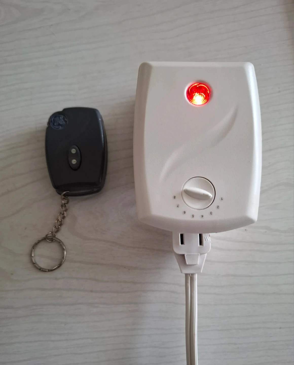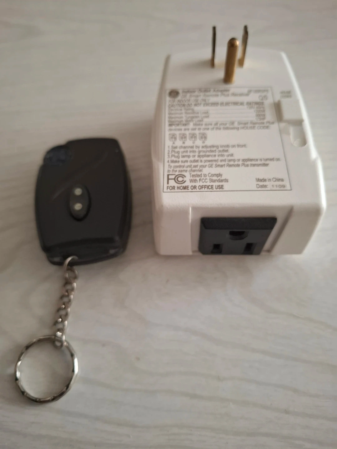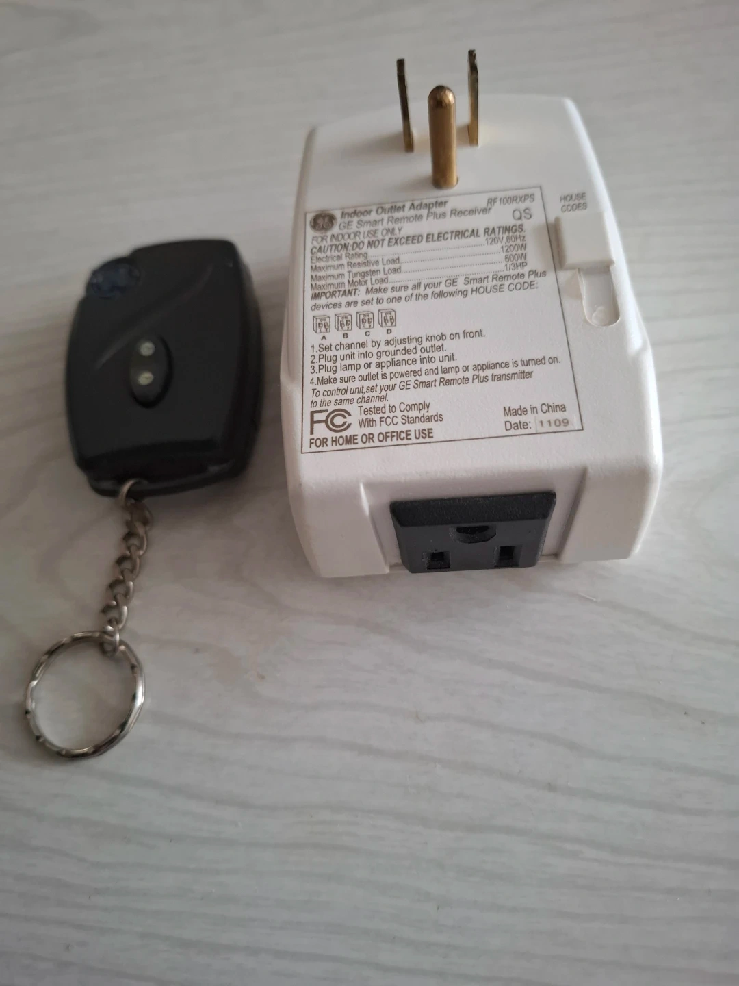 This GE Indoor Outlet Adapter lets you control lamps and appliances remotely; this used adapter is in good working condition. The Smart Remote Plus receiver has a maximum resistive load of 1250W and a maximum tungsten lamp load of 600W. It also comes with its original remote.
