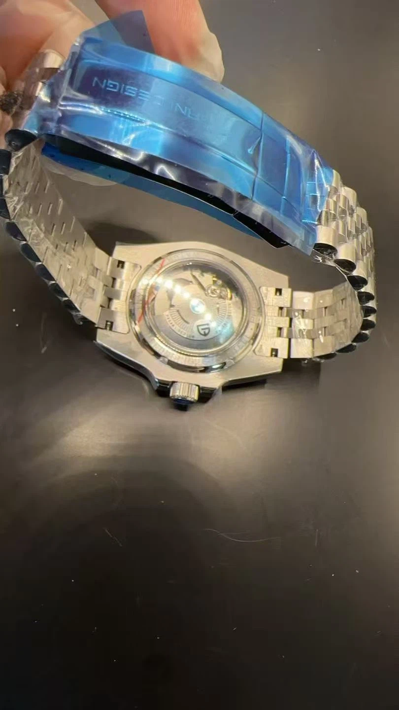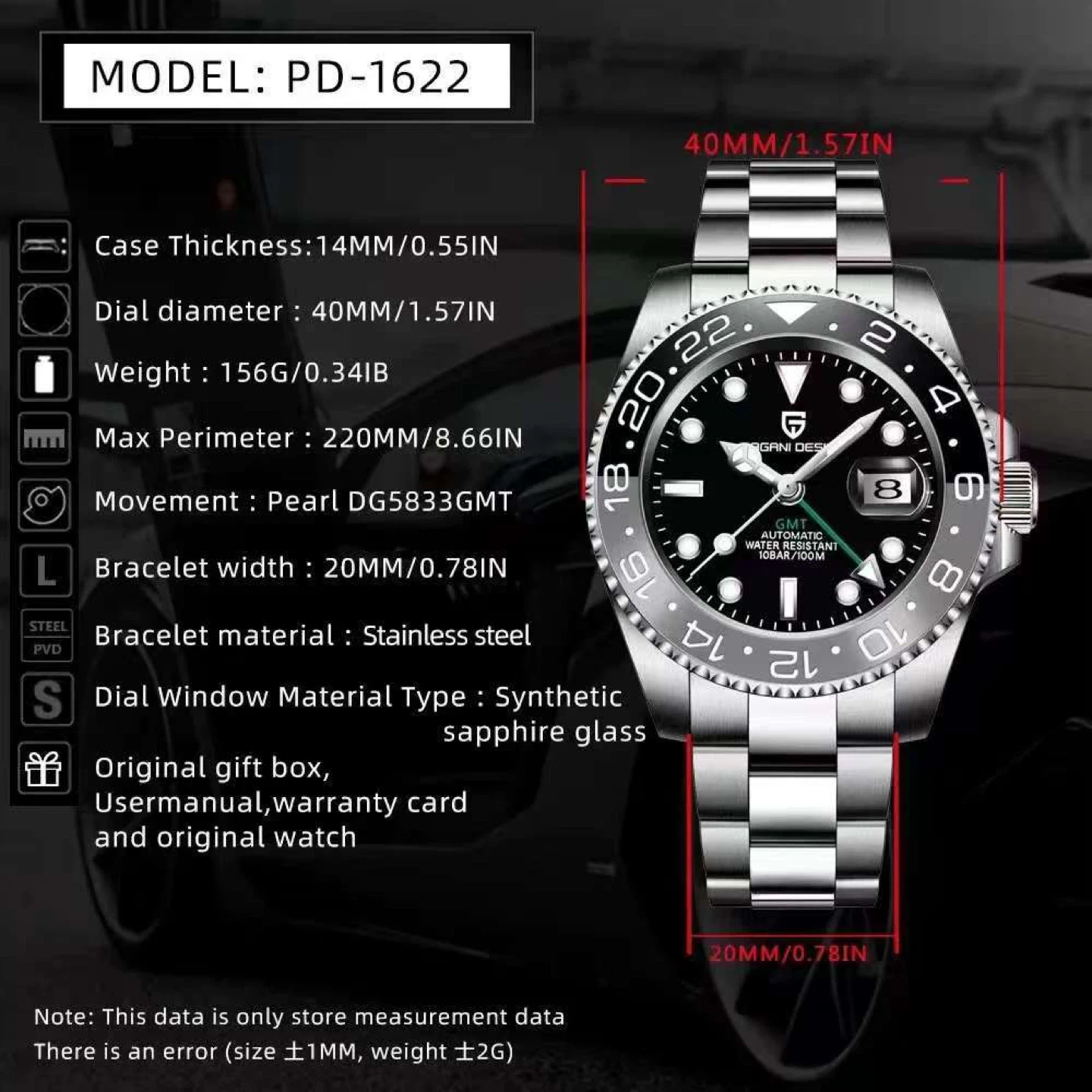 Pagani Design PD-1622 automatic GMT watch with a 40mm stainless steel case. It has a synthetic sapphire glass dial window and a water resistance of 100M. Includes original gift box, user manual, and warranty card.