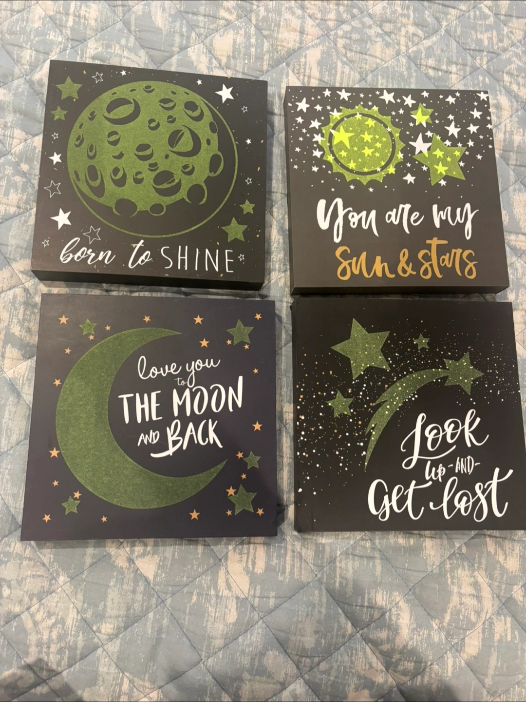 Four square decorative wall art prints featuring celestial themes. Each print has a unique design with moons and stars, some with inspirational phrases. These are perfect for adding a touch of whimsy to a nursery or child's room.