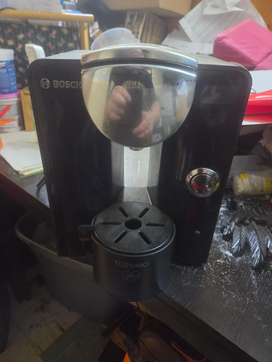 Selling a Bosch Tassimo coffee maker! It's in good condition and ready to make some delicious coffee or other hot beverages. Perfect for a quick and easy caffeine fix in the morning! Just cleaning storage area out