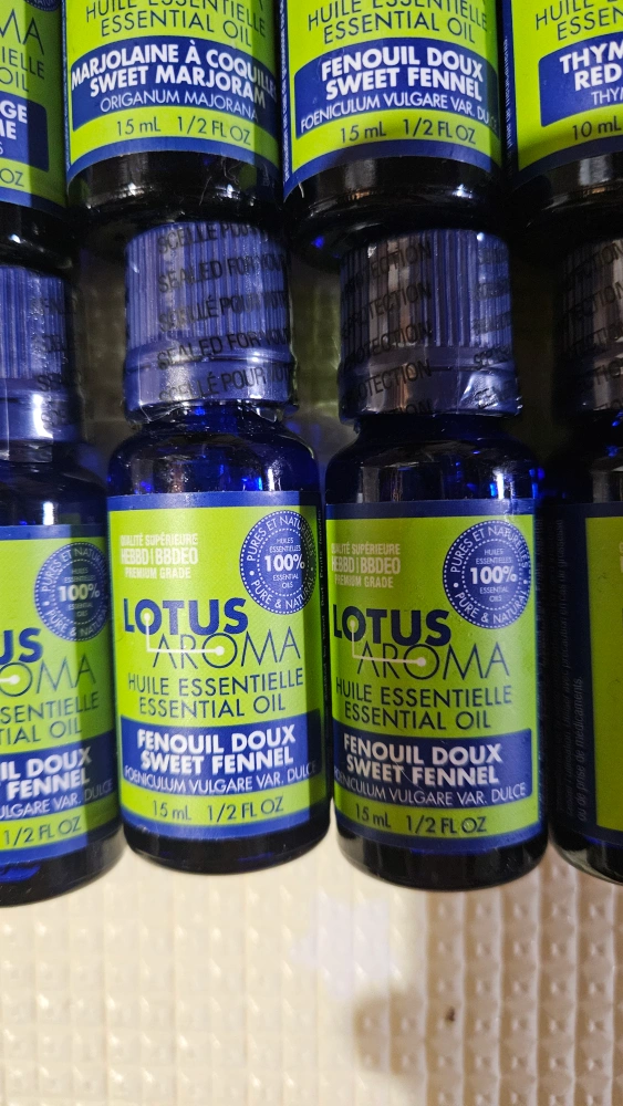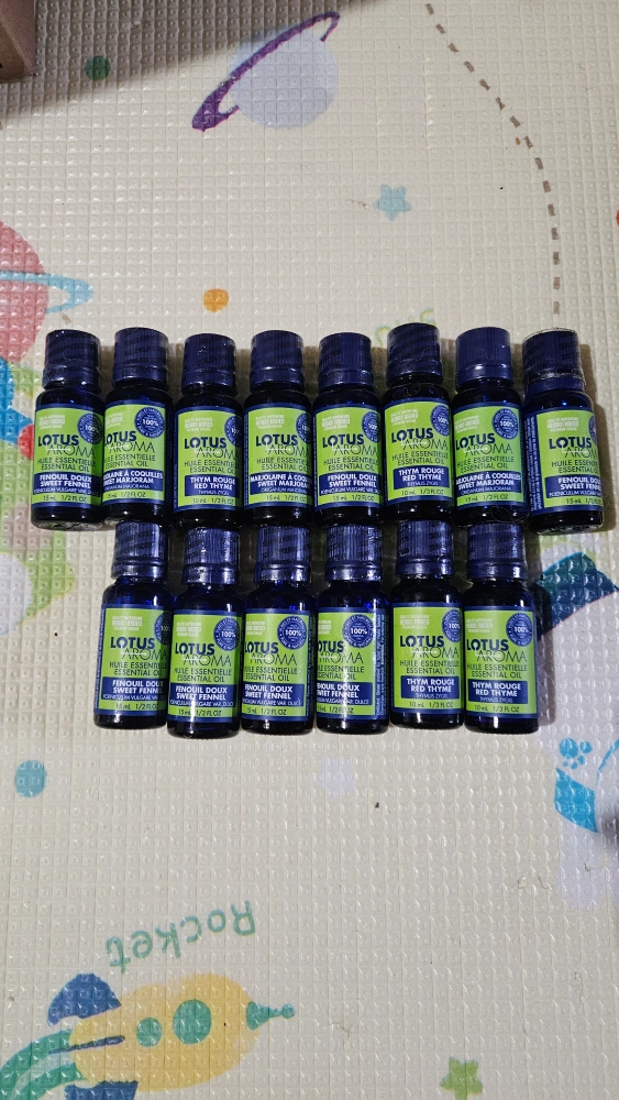 Twelve 15ml bottles of various essential oils. Includes sweet fennel, sweet marjoram, and red thyme. Some 10ml bottles included. 100% pure and natural.