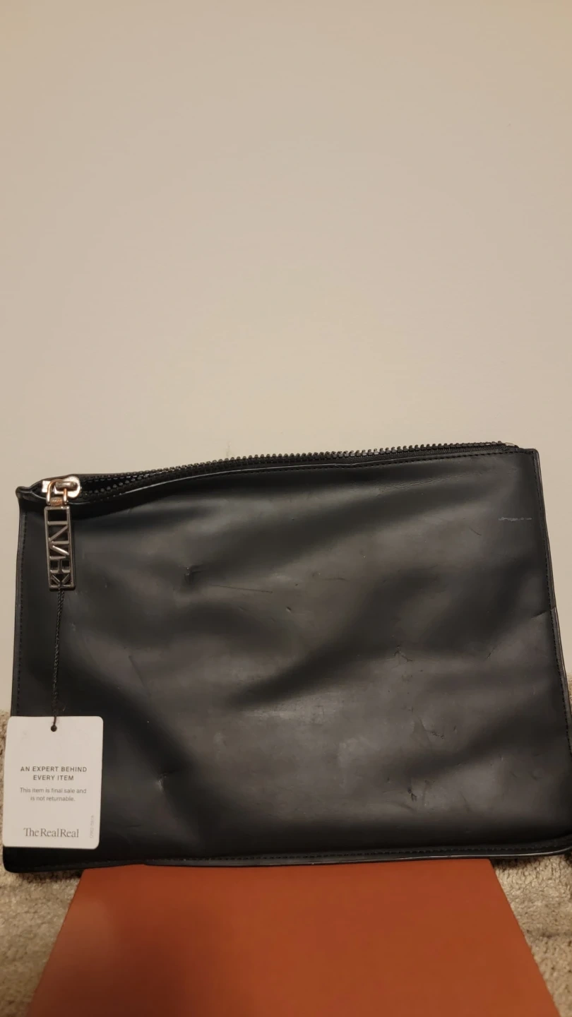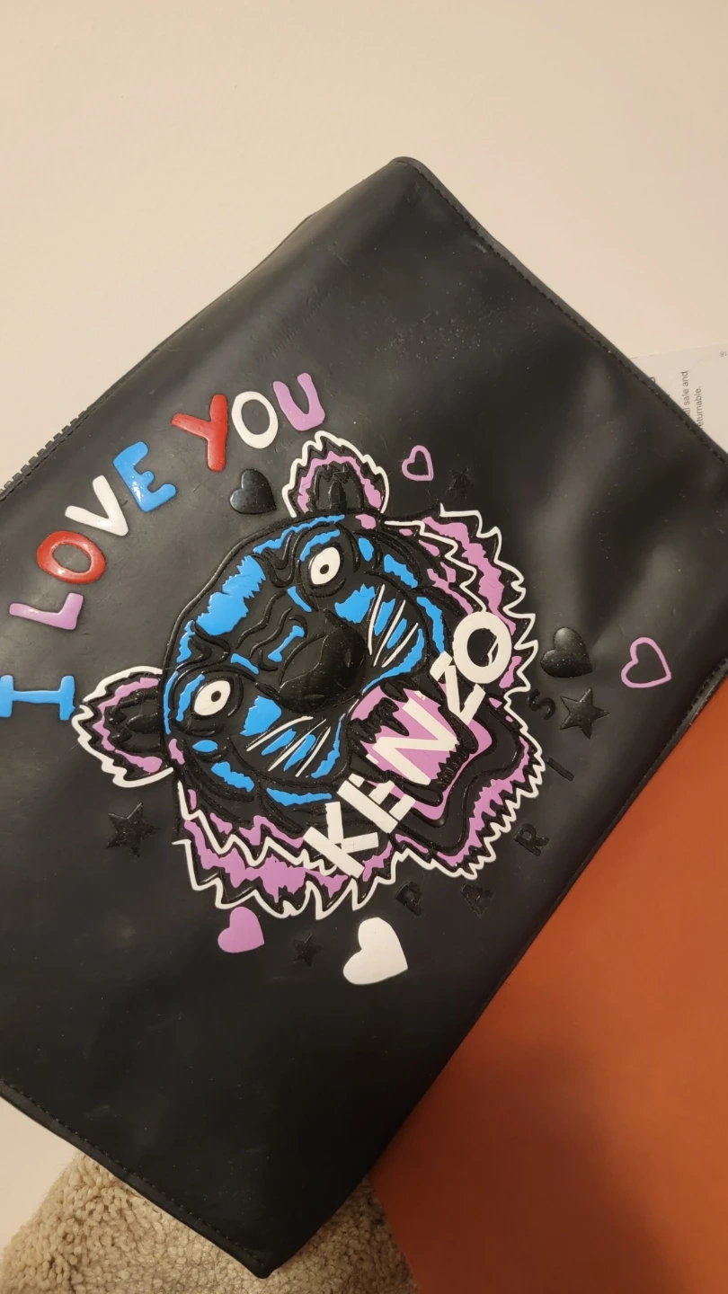 This KENZO clutch pouch features the iconic tiger head design with "I LOVE YOU" text. Black faux leather material with colourful 3D embellishments. It's a stylish accessory for carrying your essentials.