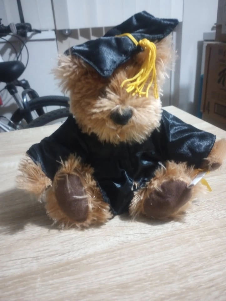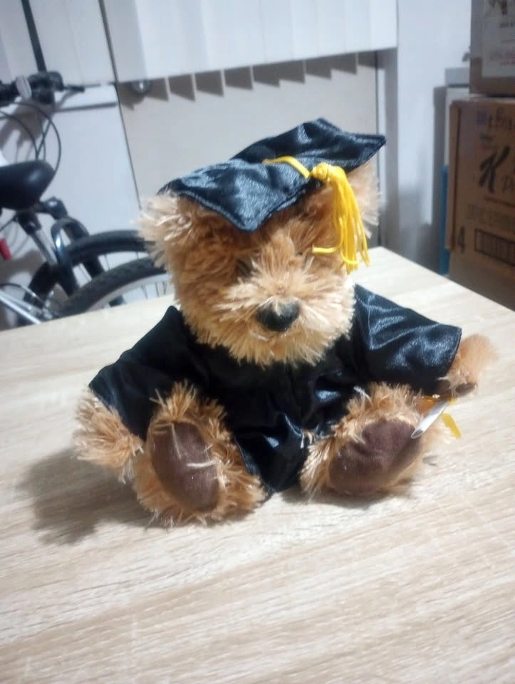 A stuffed graduation bear, about 6 inches tall. It has a voice box that requires 3 AAA batteries, but it appears to be broken as it wasn't working when tested.