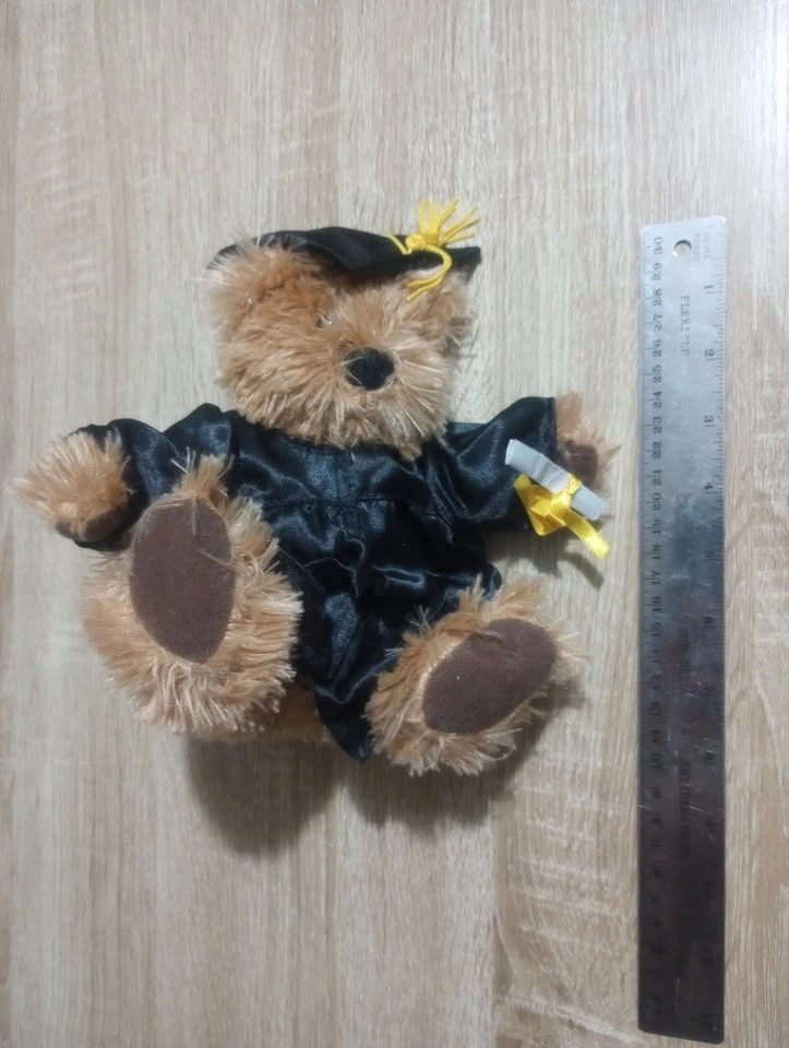 A stuffed graduation bear, about 6 inches tall. It has a voice box that requires 3 AAA batteries, but it appears to be broken as it wasn't working when tested.