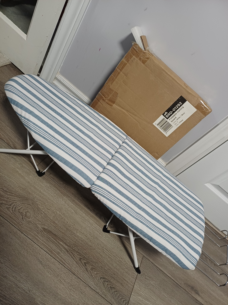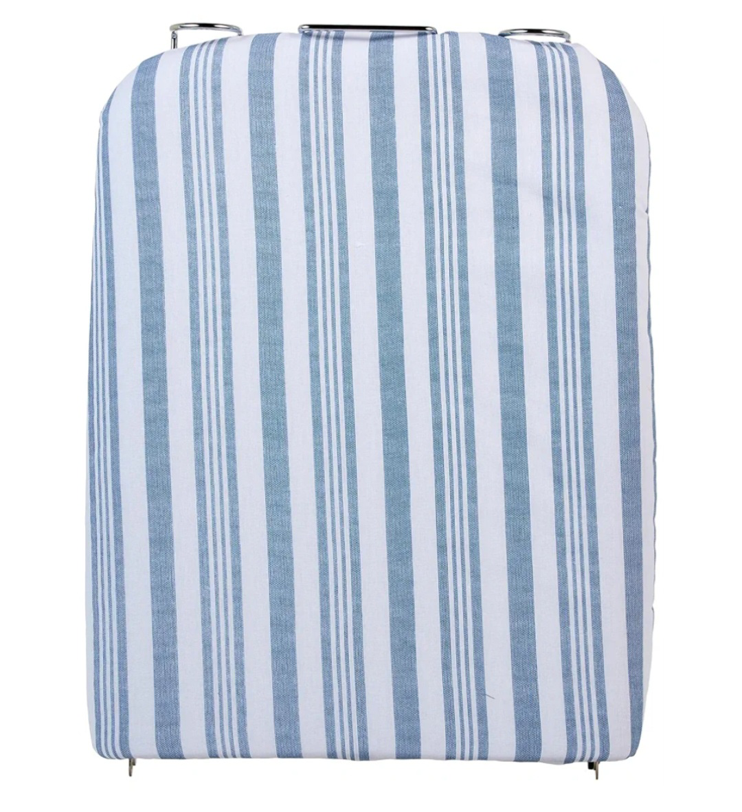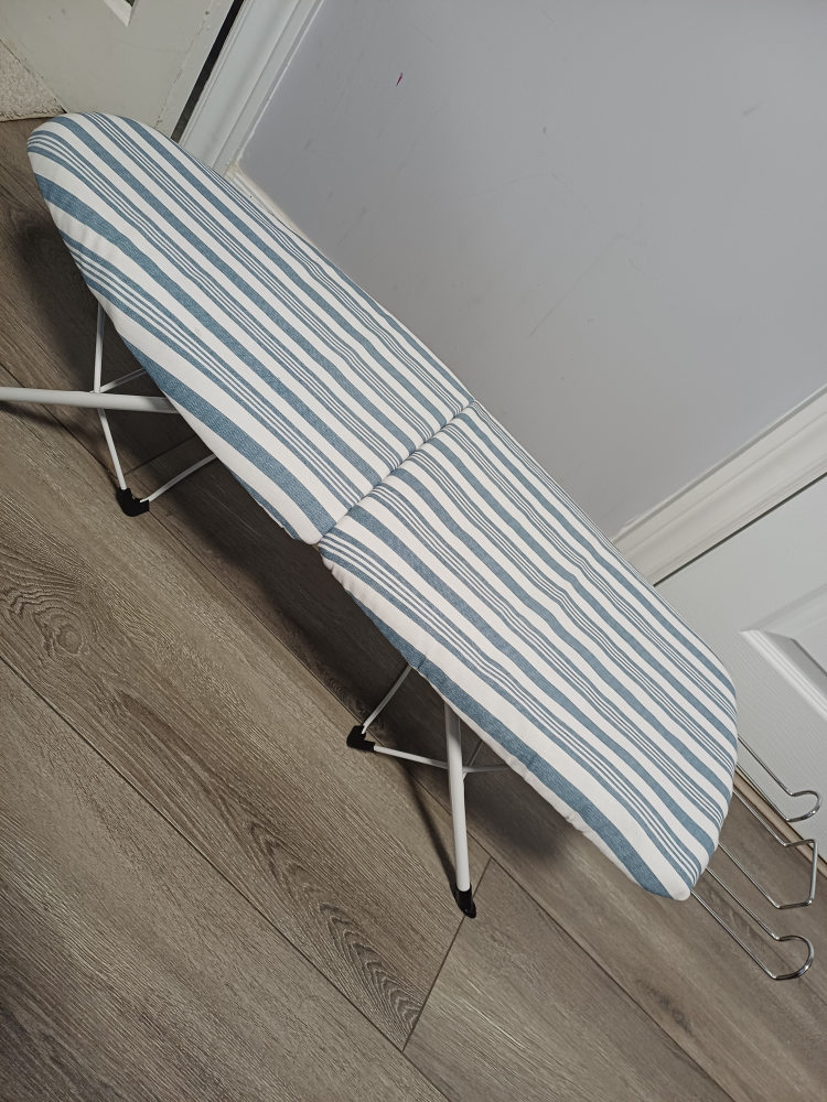 This is a portable household essential ironing board with folding legs. It features a blue and white striped cover and a metal frame. So easy to use and store.