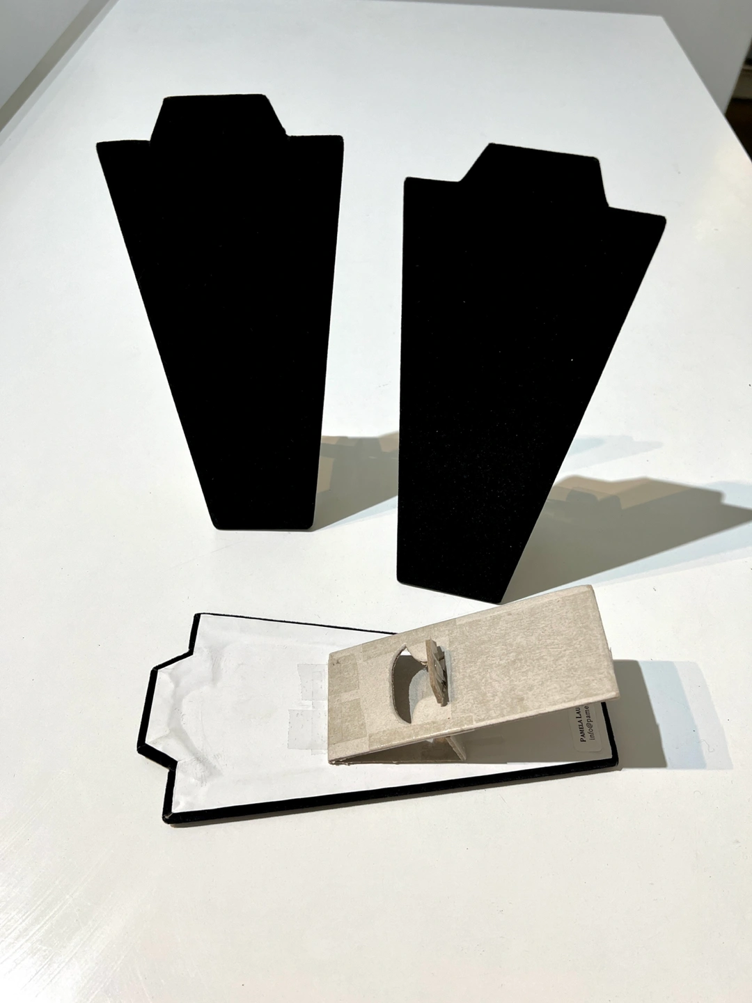 Set of 3 collapsible black velvet easel displays. 10” tall.