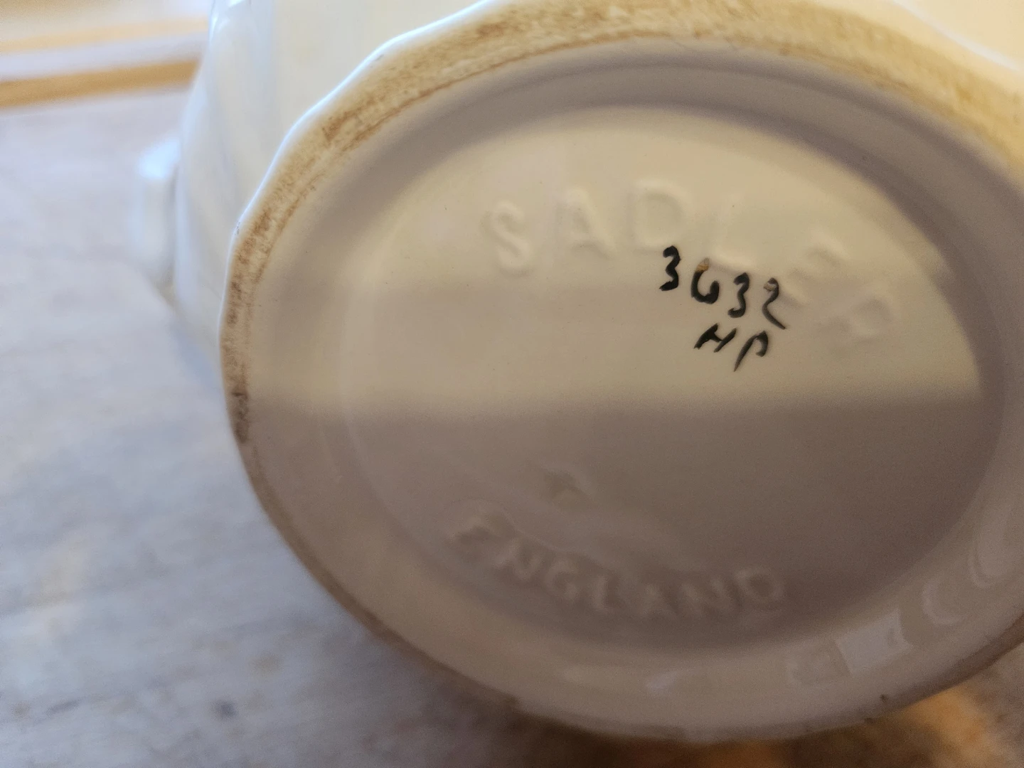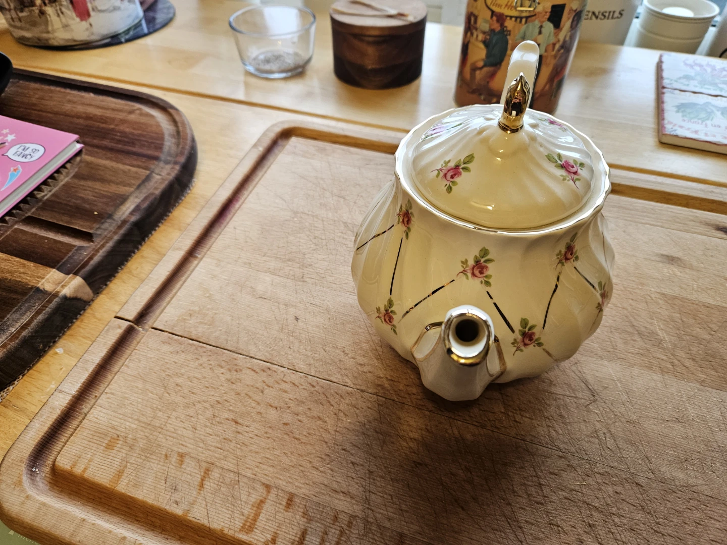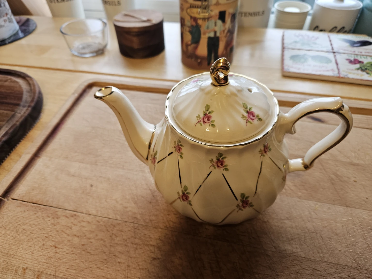 This is a Sadler England teapot, adorned with delicate pink roses and gold trim. It's a charming addition for any tea enthusiast. Ceramic material. Made in England.