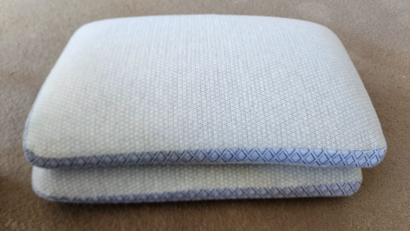 Two light grey memory foam pillows. Medium size, 16 x 25 inches, ideal for queen beds. Soft, comfortable material. Subtle diamond pattern edging.