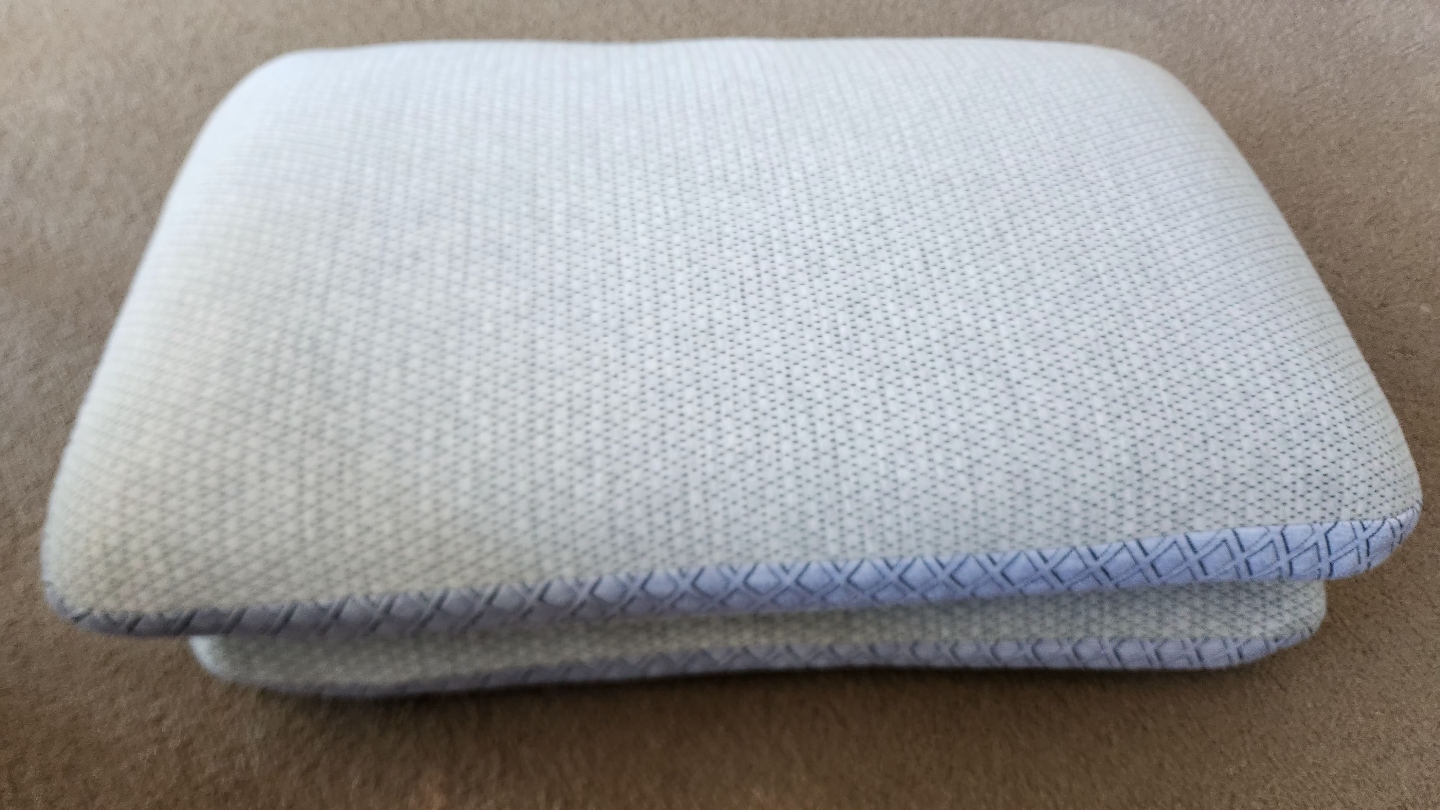 Two light grey memory foam pillows. Medium size, 16 x 25 inches, ideal for queen beds. Soft, comfortable material. Subtle diamond pattern edging.
