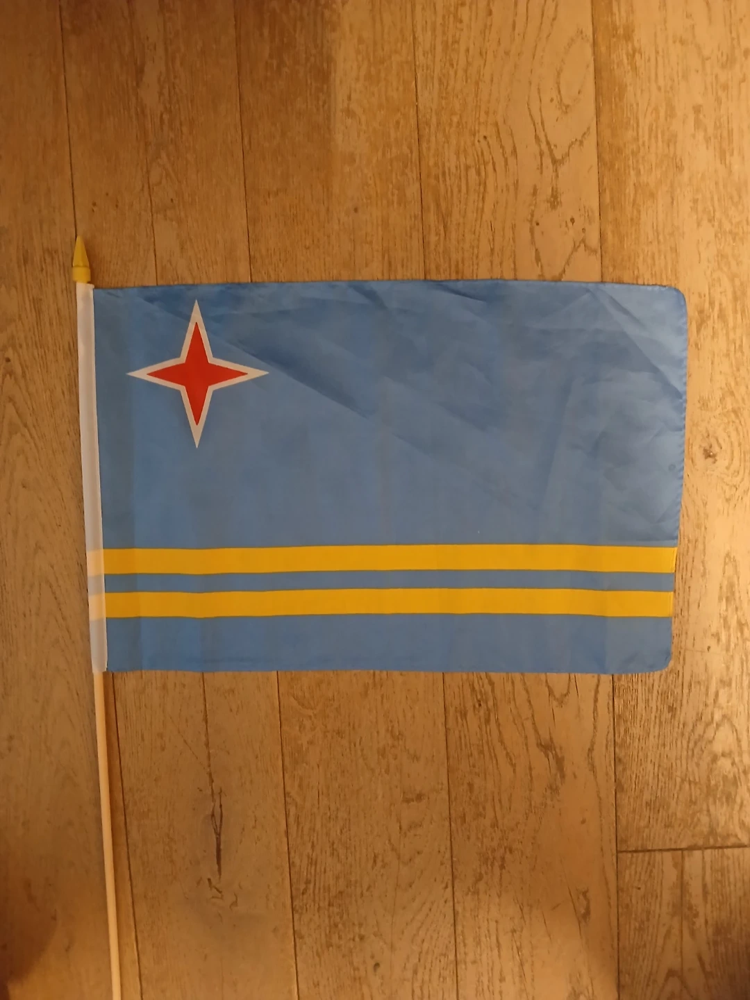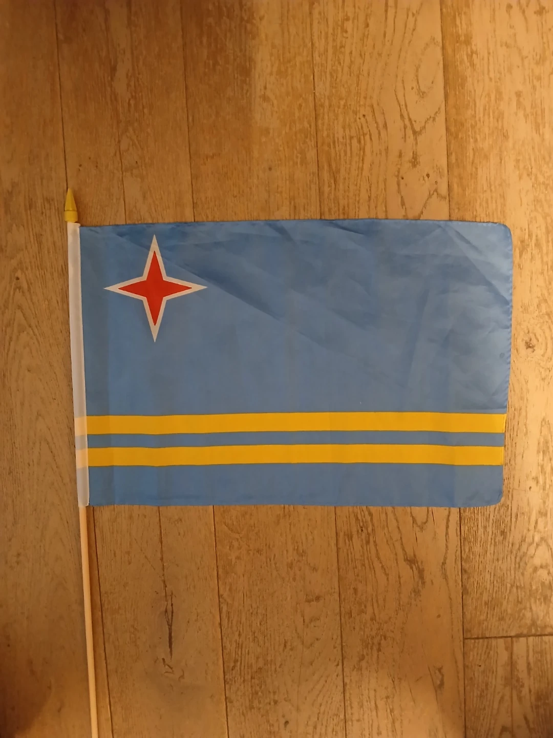 Light blue flag with yellow stripes and a red star. It's attached to a wooden stick for easy waving. Great for displaying national pride or as a travel souvenir!