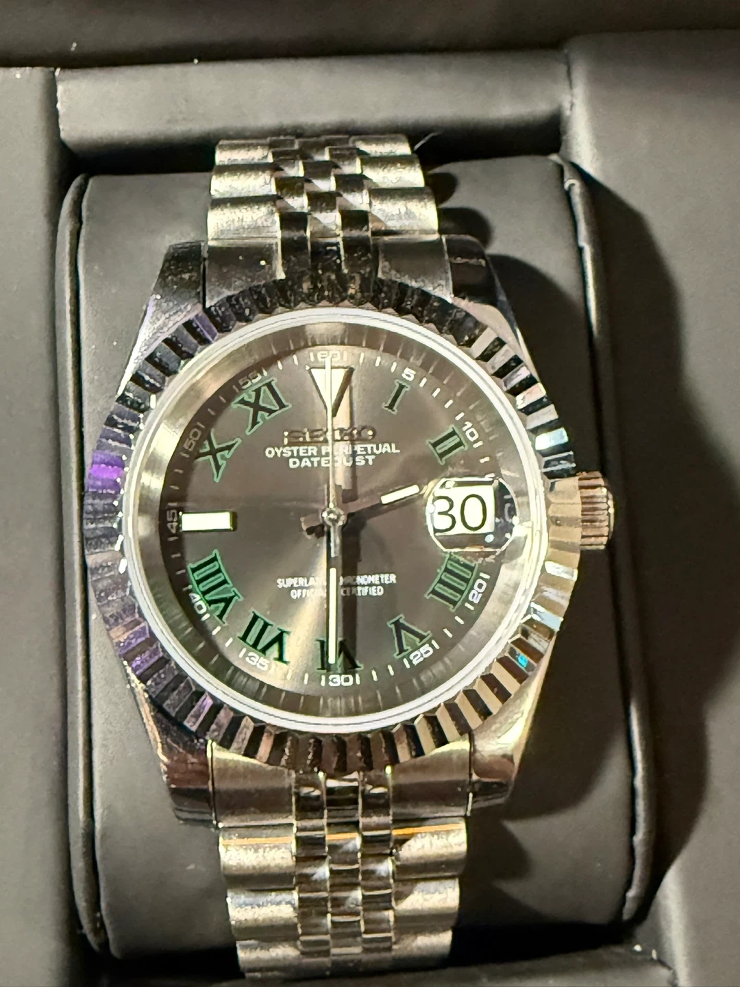 This is a Seiko Oyster Perpetual Datejust watch with a grey dial. It features a fluted bezel and a Jubilee bracelet. The watch comes in its original box.