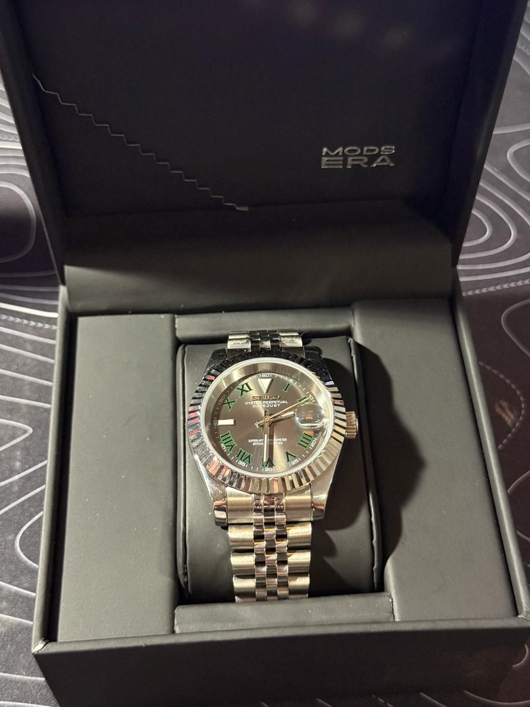 This is a Seiko Oyster Perpetual Datejust watch with a grey dial. It features a fluted bezel and a Jubilee bracelet. The watch comes in its original box.