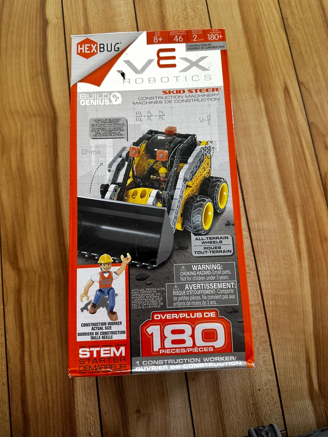 Brand new, unopened Vex Robotics Skid Steer construction set. Over 180 pieces. Includes construction worker figure. STEM starter kit. All-terrain wheels. Snap pieces. Compatible with Vex Robotics. Been opened but nothing has been touched , everything in place